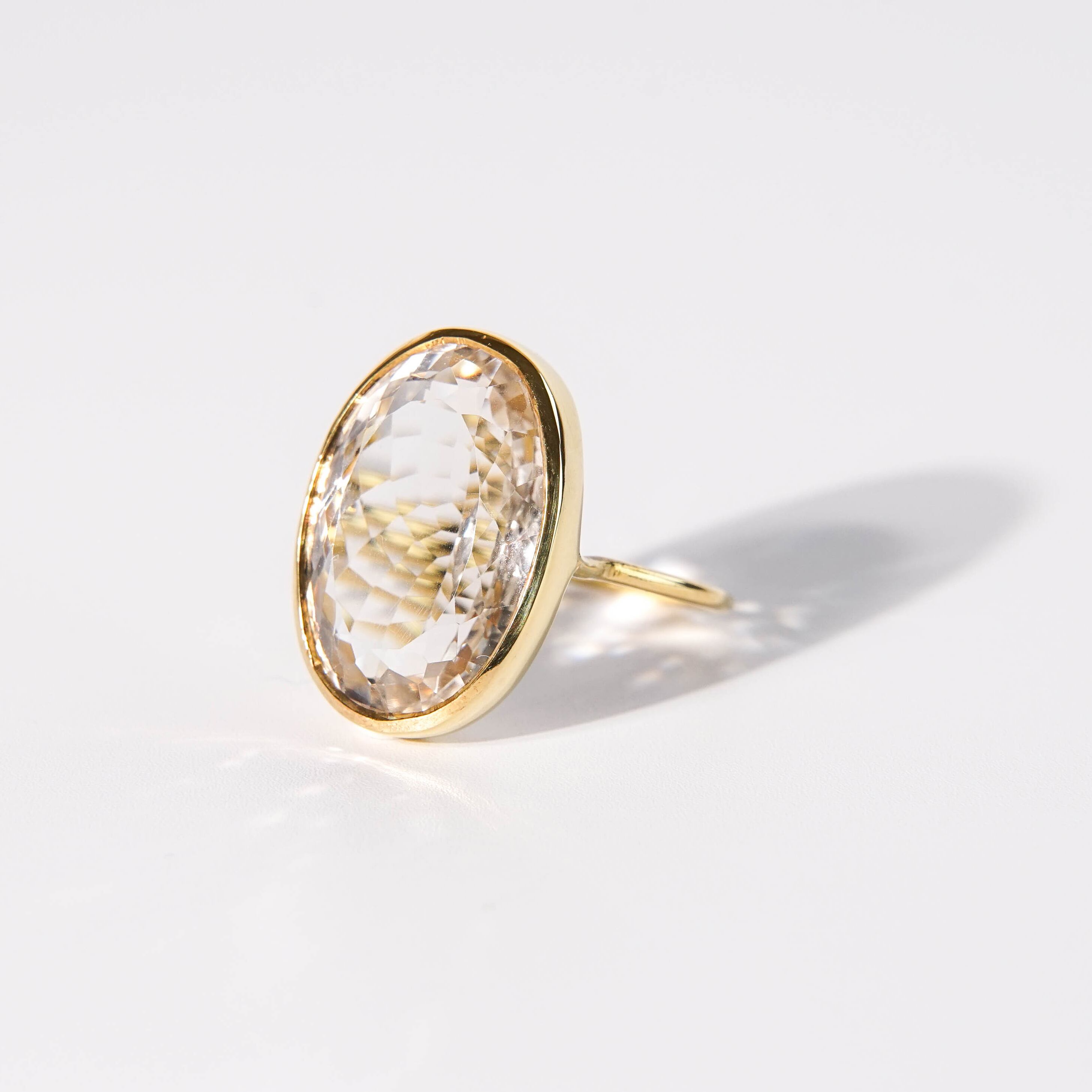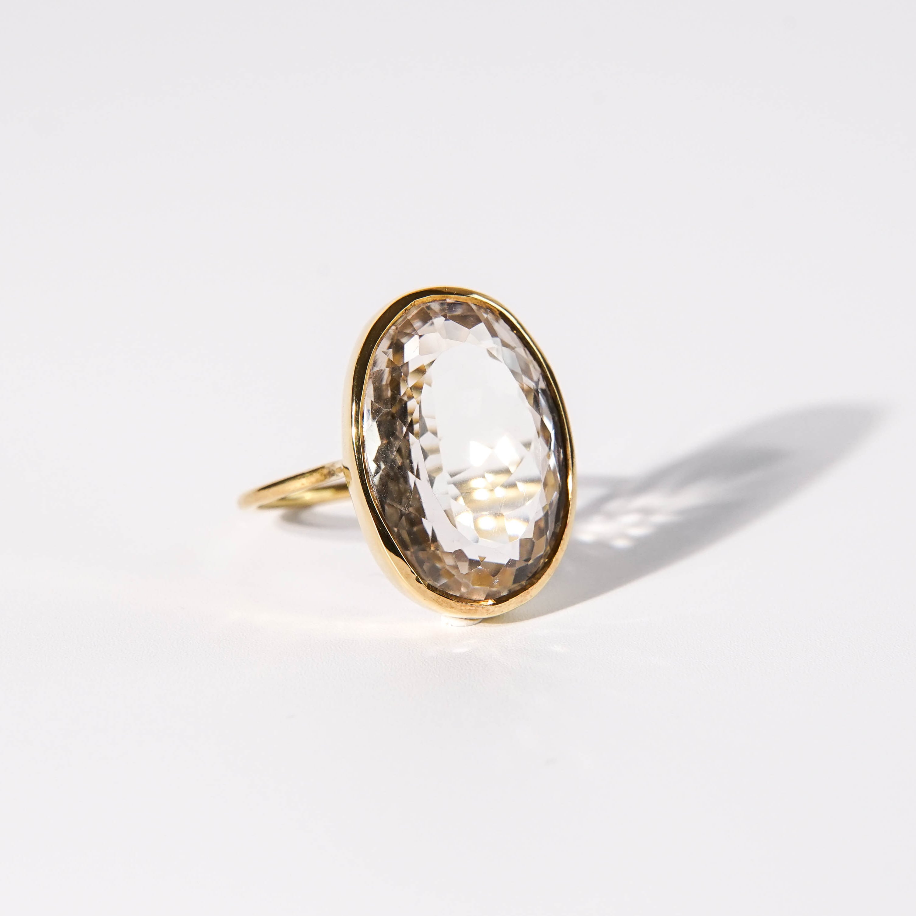 どこまでもクリアで美しいクリスタル(水晶)をシンプルに仕立てたリングは、あえて色石とは違った、シックでモダンな装いにぴったりなアイテムです。ユニセックスでもお使いいただけます。 贅沢な大きさのある天然石を、ゆっくりと愛でていただけるグランシリーズのひとつです。 【素材】 天然石:クリスタル ヴェルメイユ(SV925+18金マイクロコーティング) 【サイズ 】 15号 モチーフ:23.7x17.1mm 【石言葉】 浄化の石 ※ご購入の前に【GUIDE】を必ずご一読お願いいたします。