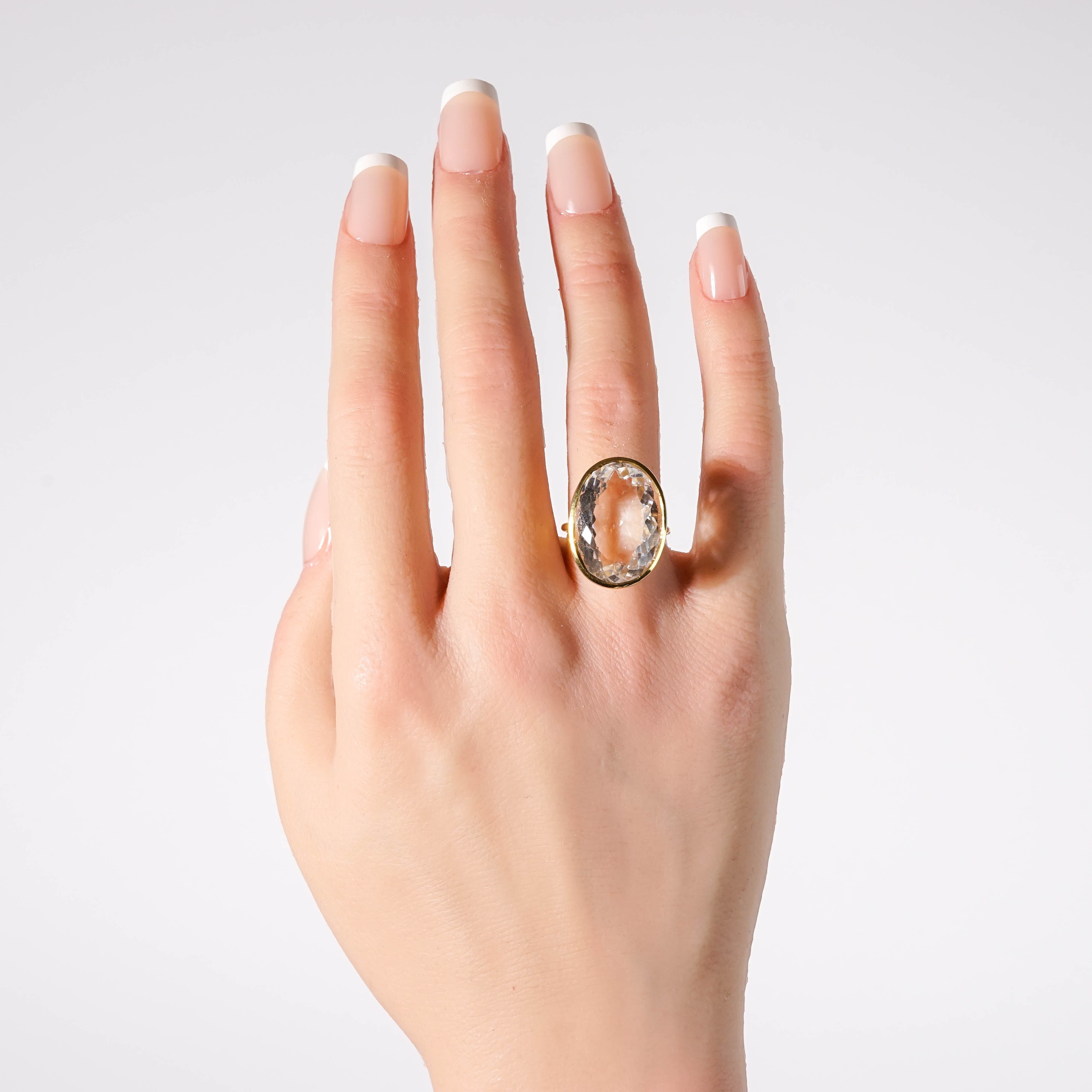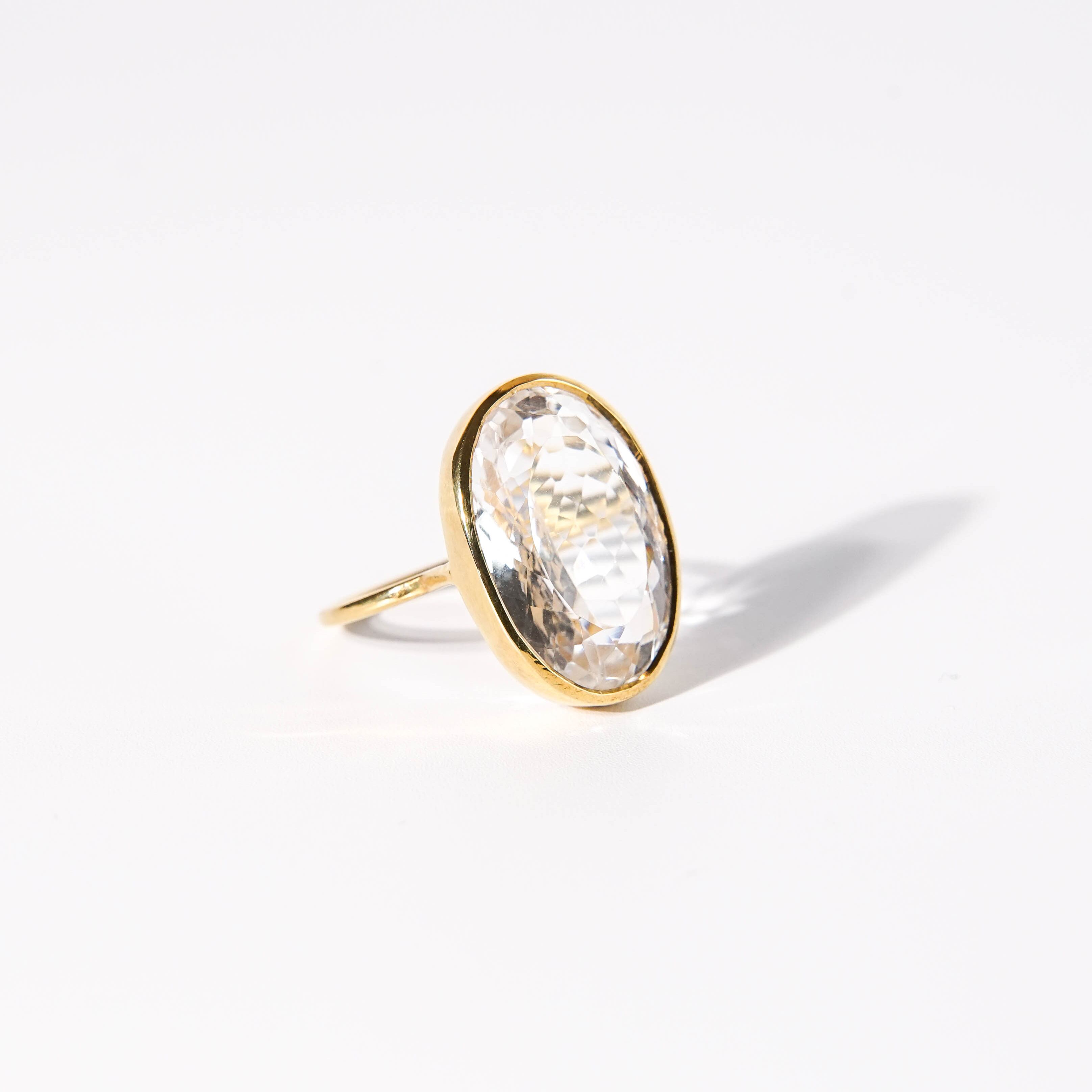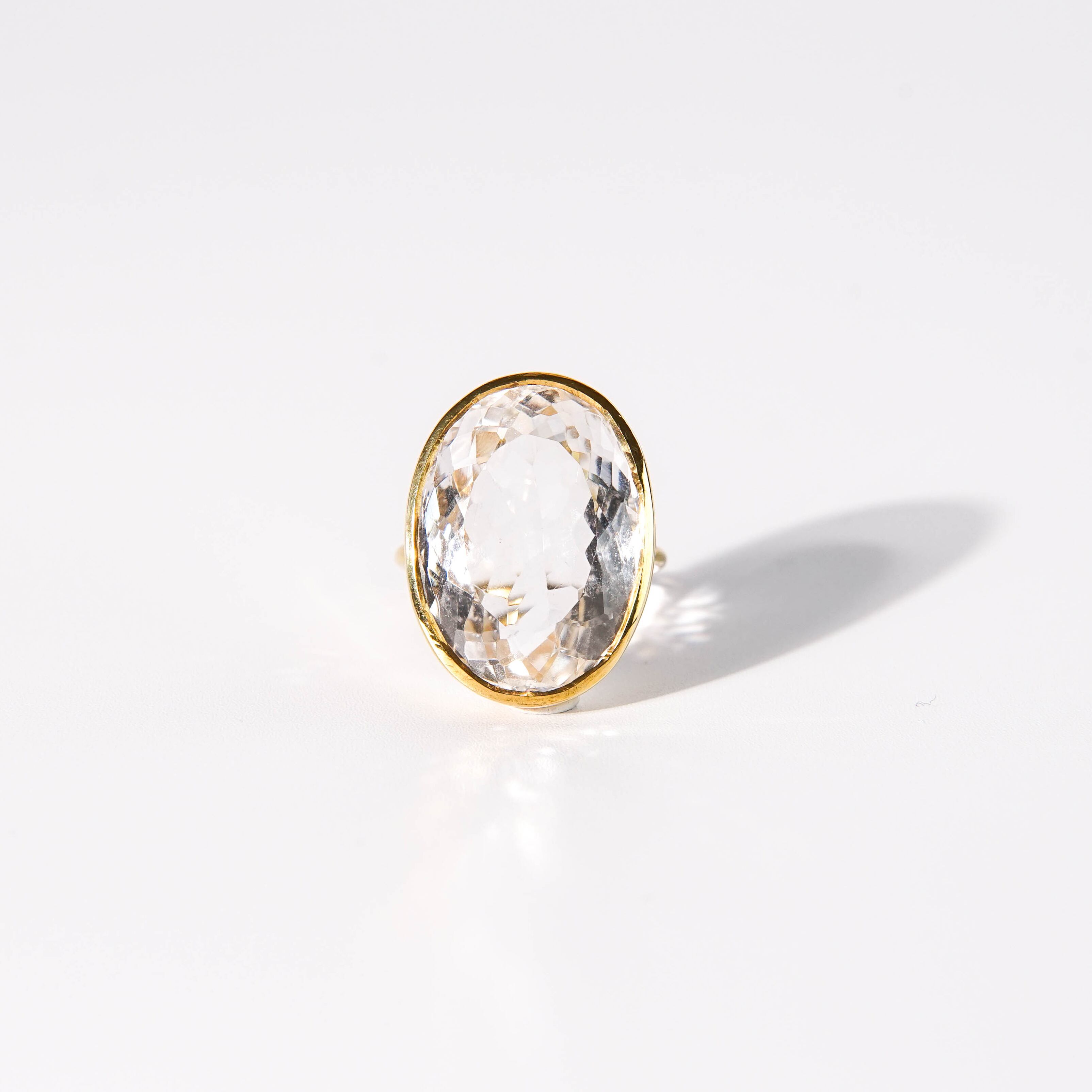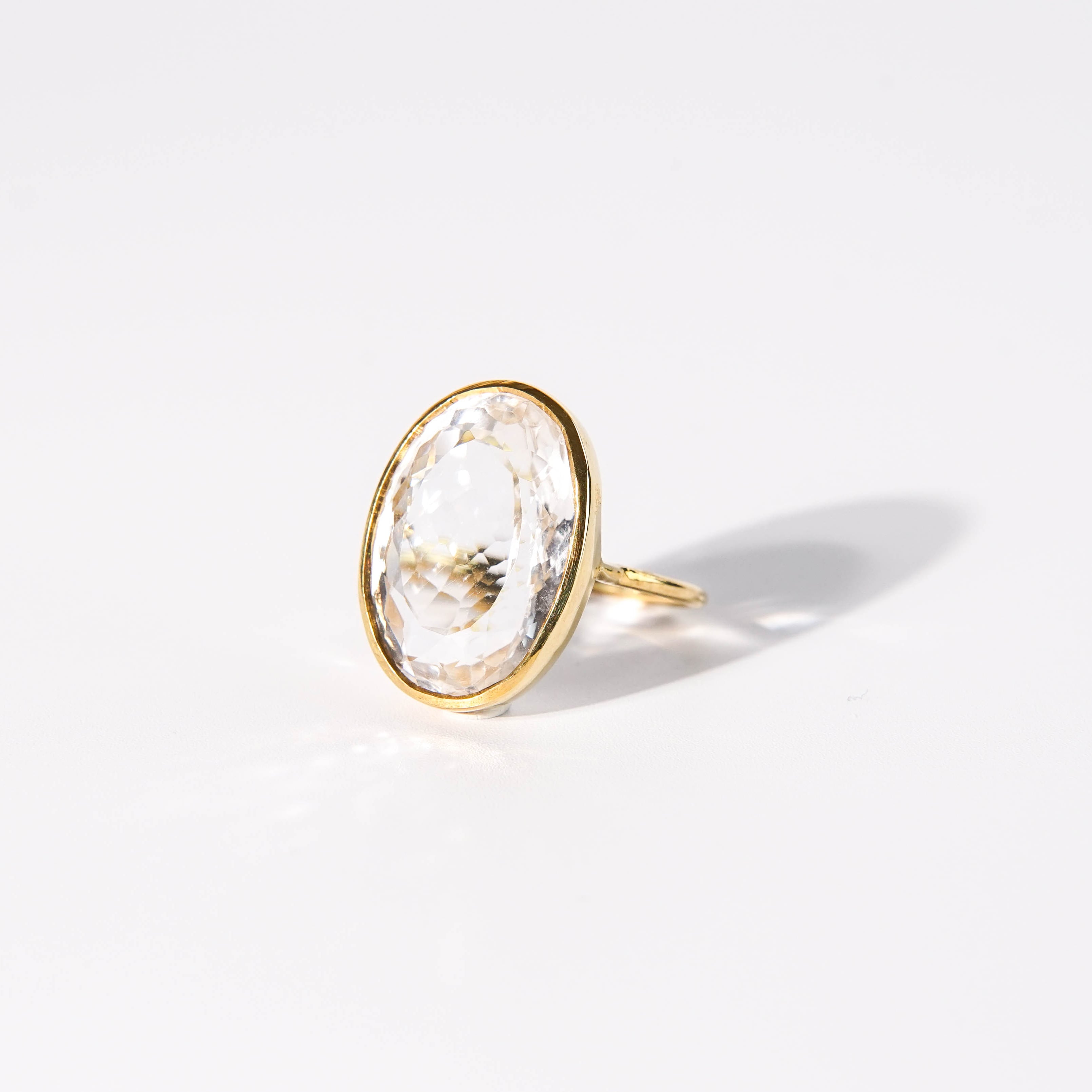 どこまでもクリアで美しいクリスタル(水晶)をシンプルに仕立てたリングは、あえて色石とは違った、シックでモダンな装いにぴったりなアイテムです。ユニセックスでもお使いいただけます。 【素材】 ヴェルメイユ(SV925+18金マイクロコーティング) 天然石:クリスタル 【サイズ 】 9号 モチーフ:22.0x16.1mm 【石言葉】 浄化の石 ※ご購入の前に【GUIDE】を必ずご一読お願いいたします。