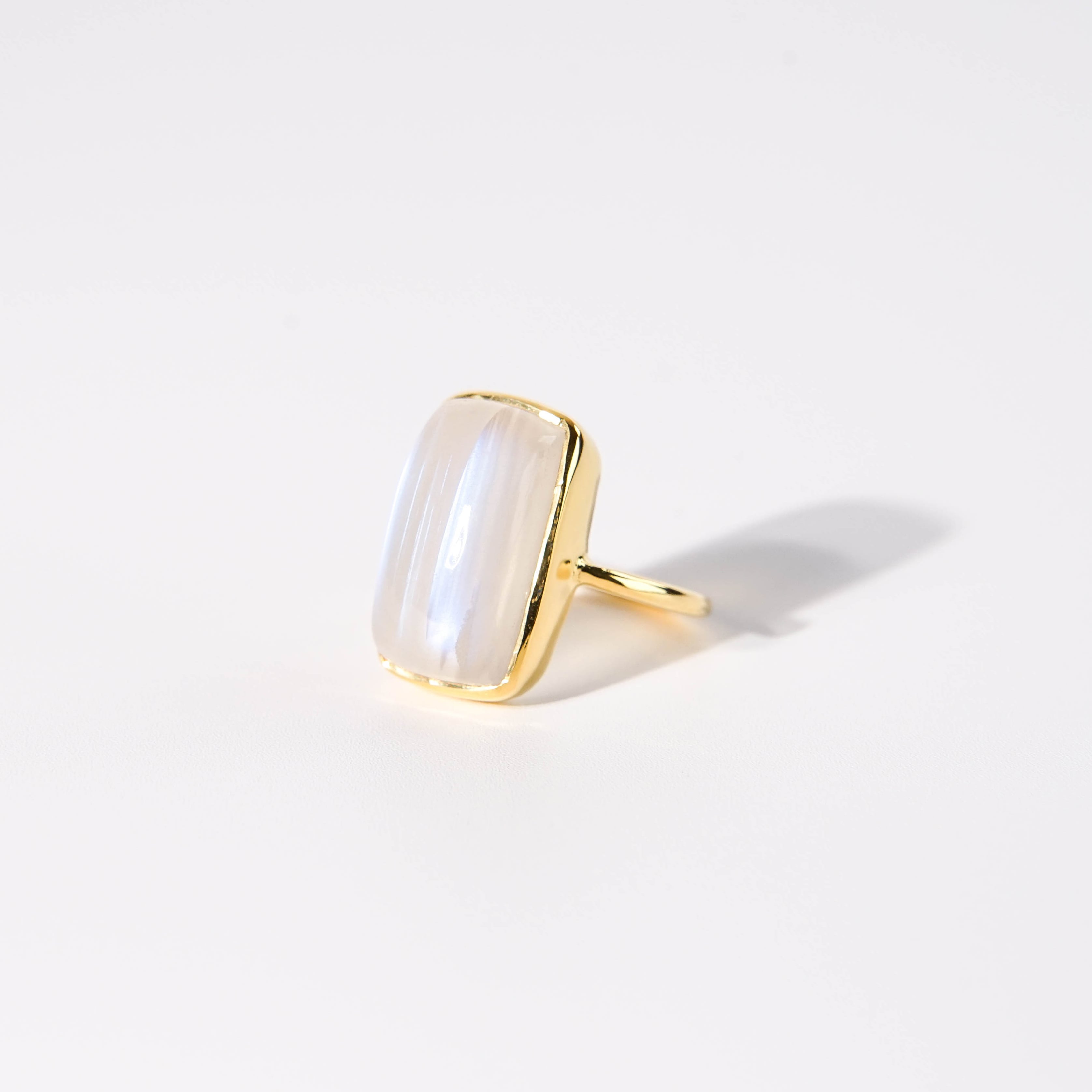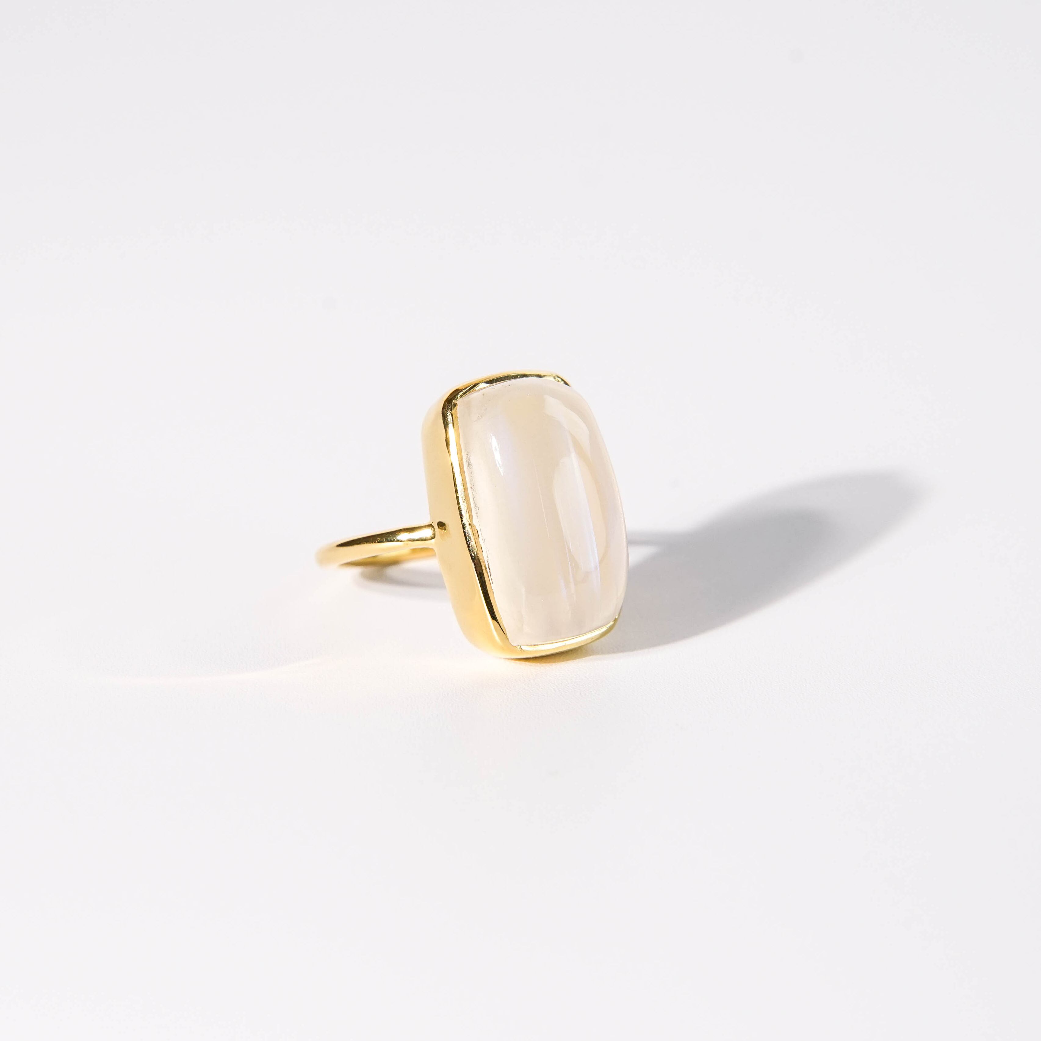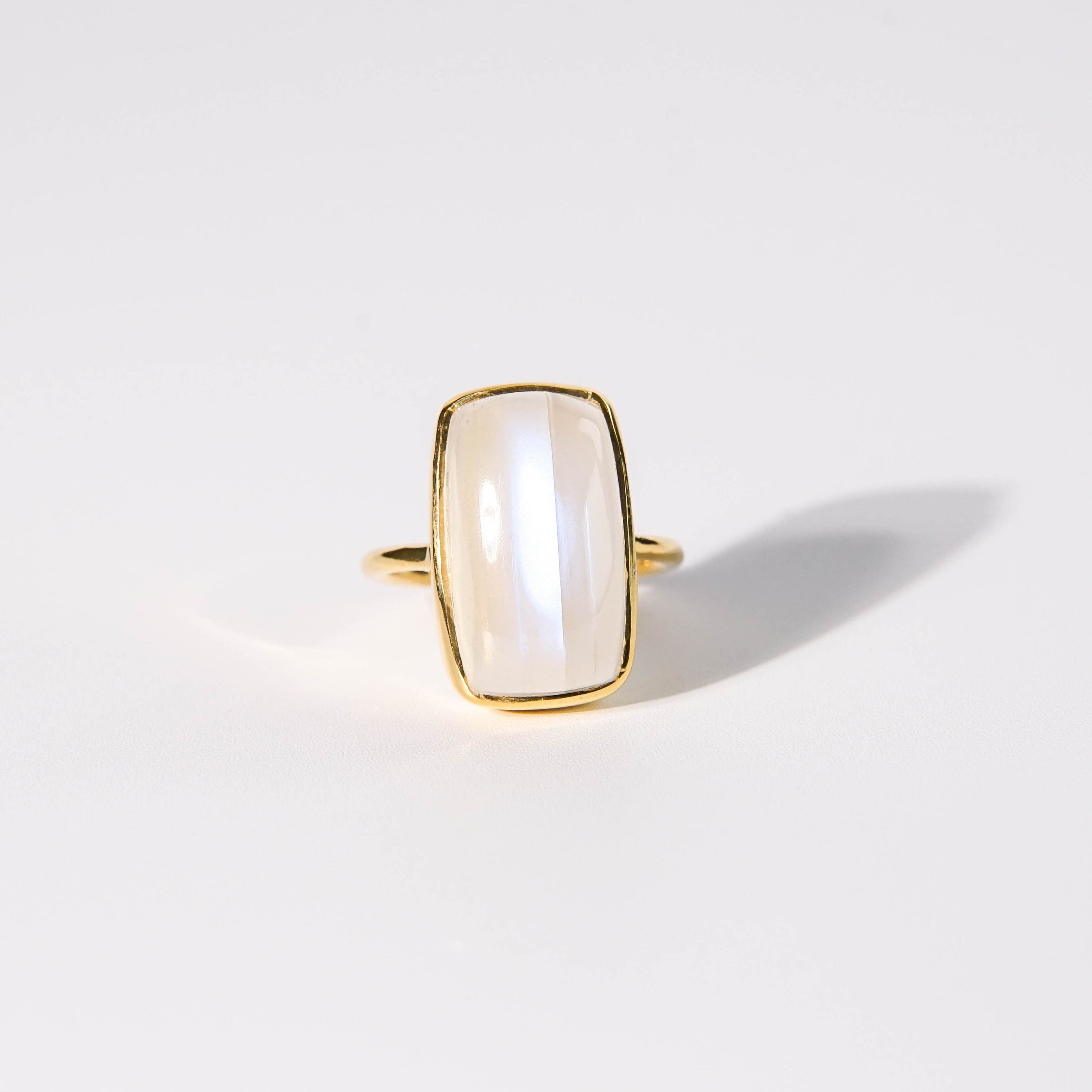 動きに合わせて内側から光が揺らめくムーンストーンは、大粒ならではの透明感と光沢が美しい天然石です。角度によってはブルーに輝くものもあり、その表情の変化もまた魅力のひとつです。 【素材】 ヴェルメイユ(SV925+18金マイクロコーティング) 天然石:ムーンストーン 【サイズ 】 13号 モチーフ:19.9x12.5mm 【石言葉】 神秘的な月のパワーを秘めた直観力を高める石 ※ご購入の前に【GUIDE】を必ずご一読お願いいたします。
