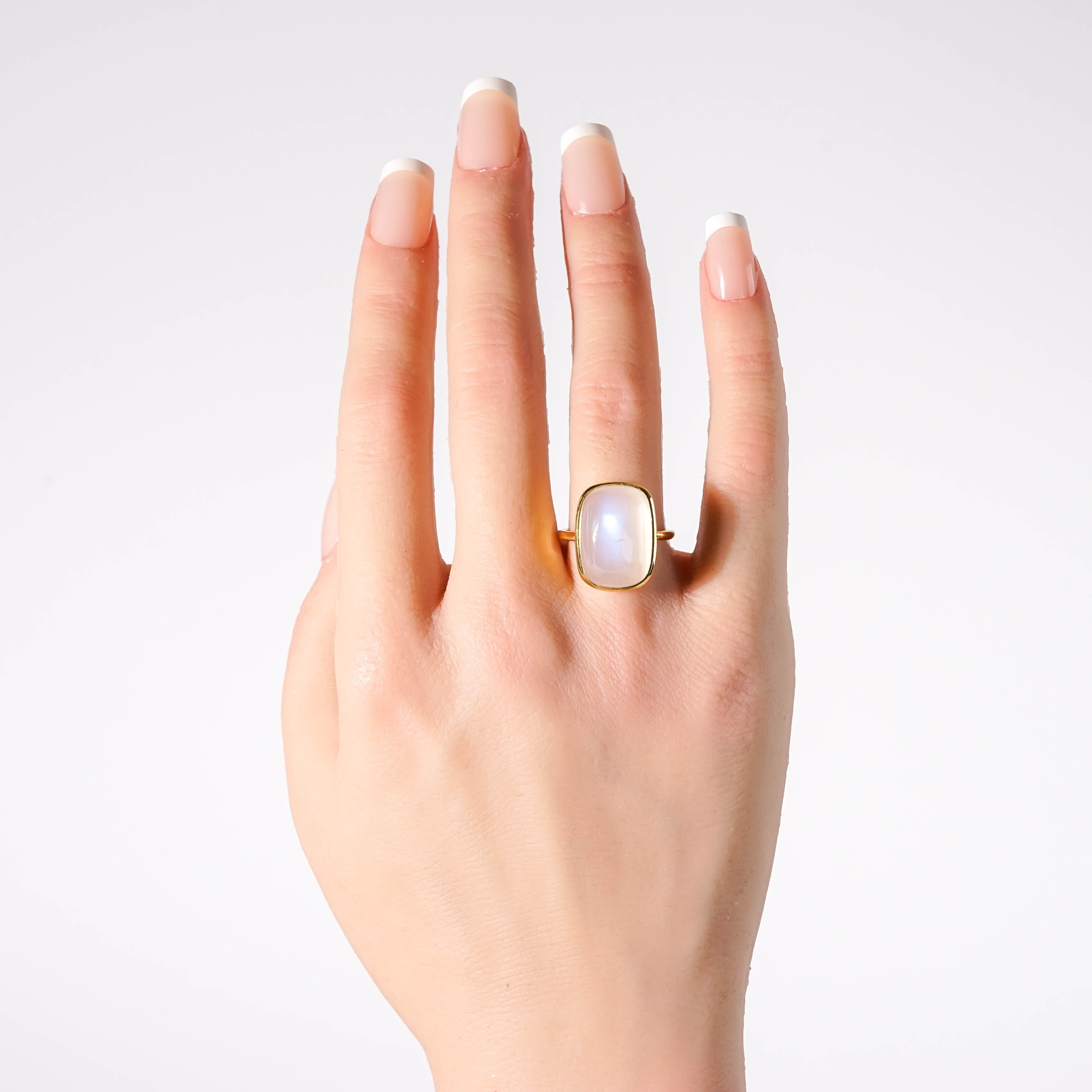 動きに合わせて内側から光が揺らめくムーンストーンは、大粒ならではの透明感と光沢が美しい天然石です。角度によってはブルーに輝くものもあり、その表情の変化もまた魅力のひとつです。 【素材】 ヴェルメイユ(SV925+18金マイクロコーティング) 天然石:ムーンストーン 【サイズ 】 12号 モチーフ:18.4x13.4mm 【石言葉】 神秘的な月のパワーを秘めた直観力を高める石 ※ご購入の前に【GUIDE】を必ずご一読お願いいたします。