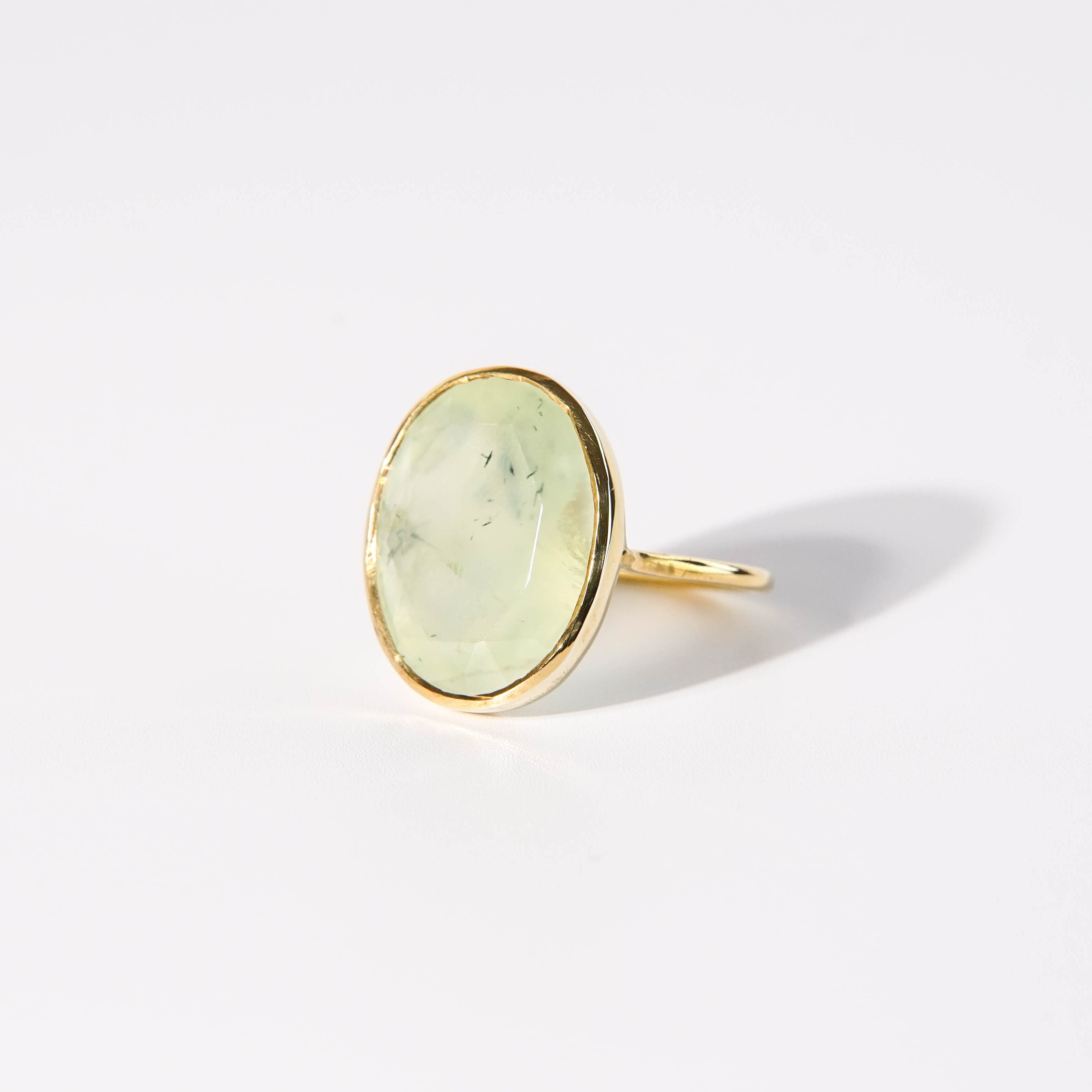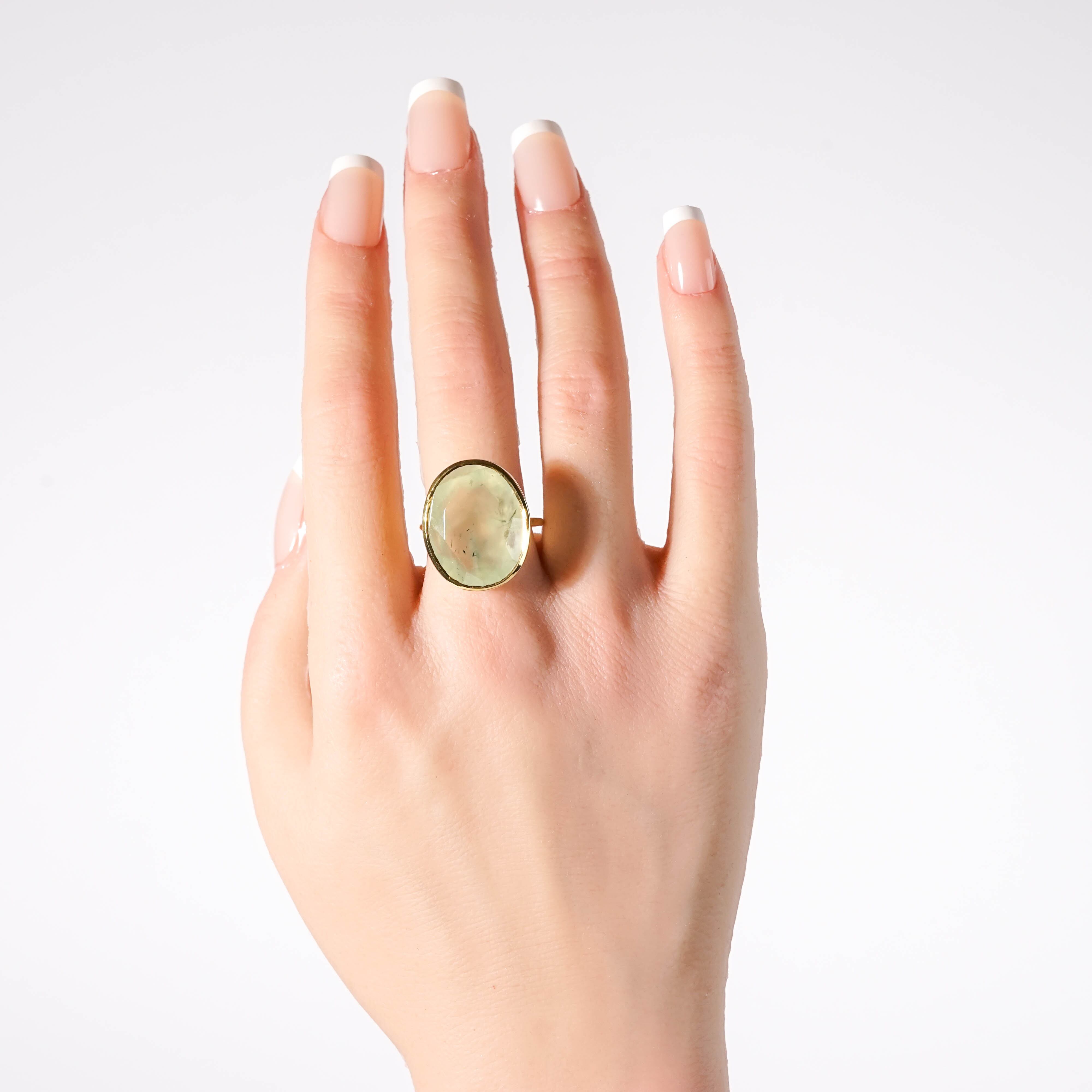 淡く優しい色合いが特徴のプレナイトは、ほんのりインクルージョン(内包物)鉱物感のある天然石ピースでお仕立てしています。手元に自然を感じられるリングです。 【素材】 ヴェルメイユ(SV925+18金マイクロコーティング) 天然石:プレナイト 【サイズ 】 15号 モチーフ:21.5x17.7mm 【石言葉】 安らぎと健康の石 ※ご購入の前に【GUIDE】を必ずご一読お願いいたします。