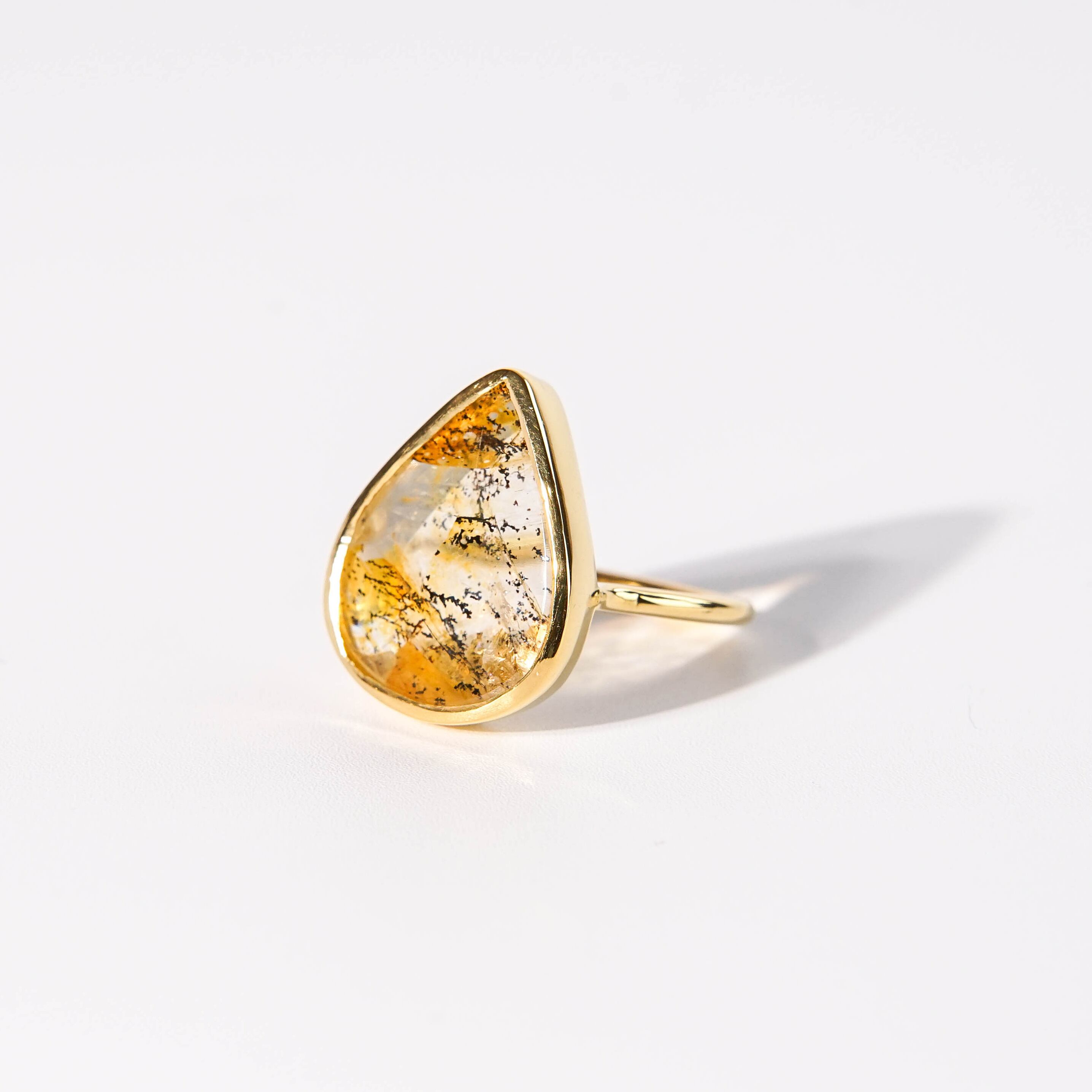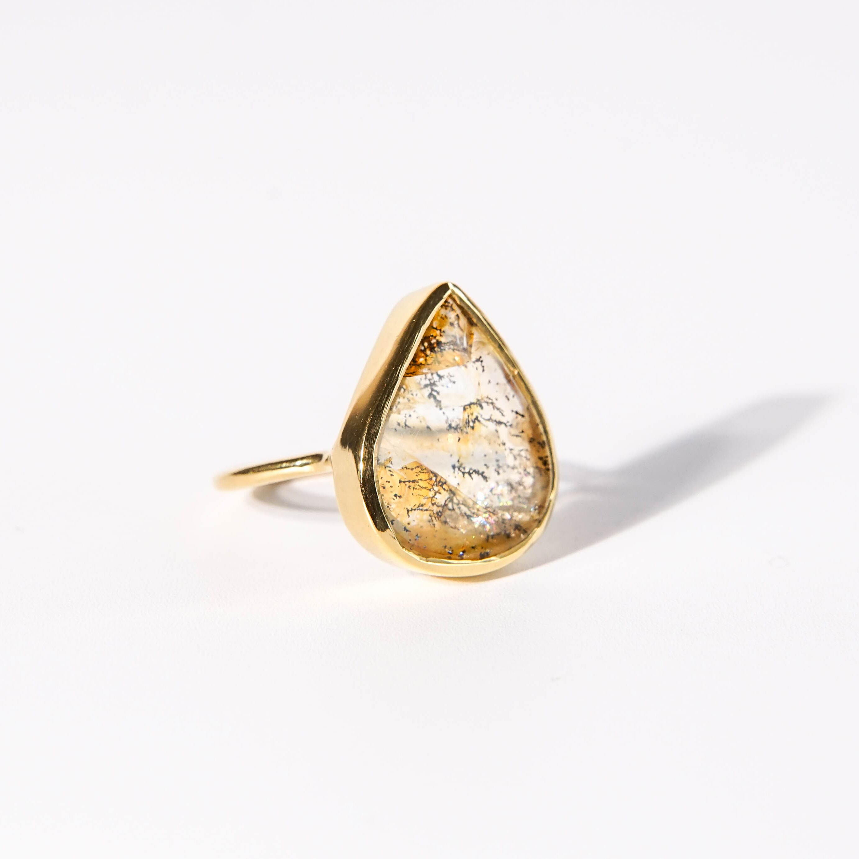 水晶の中に植物のような模様が広がるデンドリティッククォーツ は、一つ一つ表情が違い、同じものはありません。出逢ったその表情が、運命の天然石ピースです。 贅沢な大きさのある天然石を、ゆっくりと愛でていただけるグランシリーズのひとつです。 【素材】 天然石:デンドリティッククォーツ ヴェルメイユ(SV925+18金マイクロコーティング) 【サイズ 】 10号 モチーフ:19.4x16.5mm 【石言葉】 落ち着きと深い安らぎをもたらす石 ※ご購入の前に【GUIDE】を必ずご一読お願いいたします。
