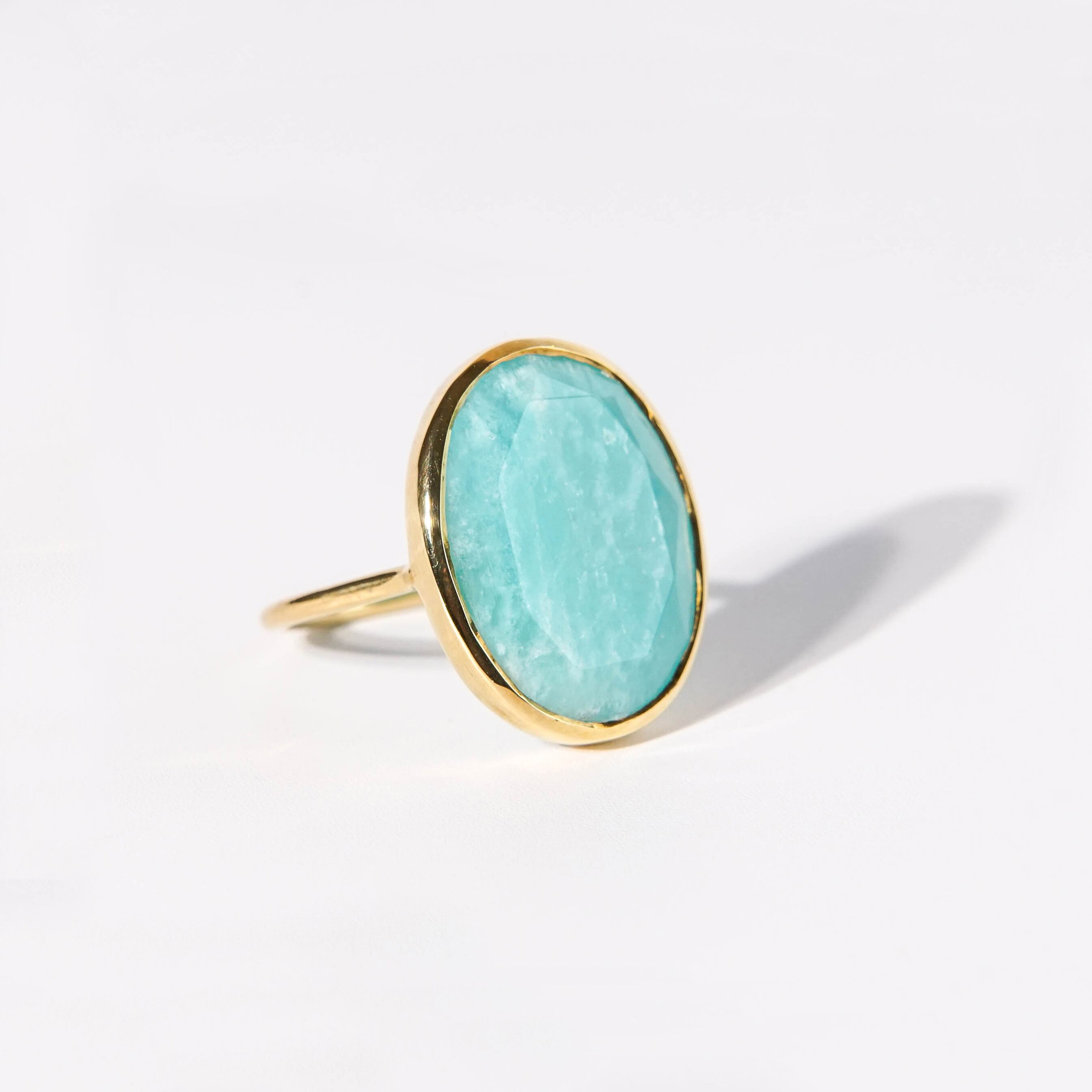 やわらかなブルーグリーンが印象的な、 アマゾナイトのリング。 どこか澄んだ空気を思わせるような色合いが、 手元に静かな明るさを添えてくれます。 グランシリーズならではの 贅沢な大きさの天然石は、 ひと目で惹かれる存在感がありながら、 アマゾナイトのやさしい色味によって 日常の装いにも自然に馴染みます。 つるりとした表面に広がる表情や、 ひとつとして同じもののない色の揺らぎも、 天然石ならではの魅力。 ふと手元を見たとき、 少し気持ちが整うような。 そんな感覚とともに、 日々の中でゆっくりと愉しんでいただきたいひとつです。 【素材】 ヴェルメイユ(SV925+18金マイクロコーティング) 天然石:アマゾナイト 【サイズ 】 12号 モチーフ:21.7X18.0mm 【石言葉】 心身を整え、行動をサポートする石 ※ご購入の前に【GUIDE】を必ずご一読お願いいたします。