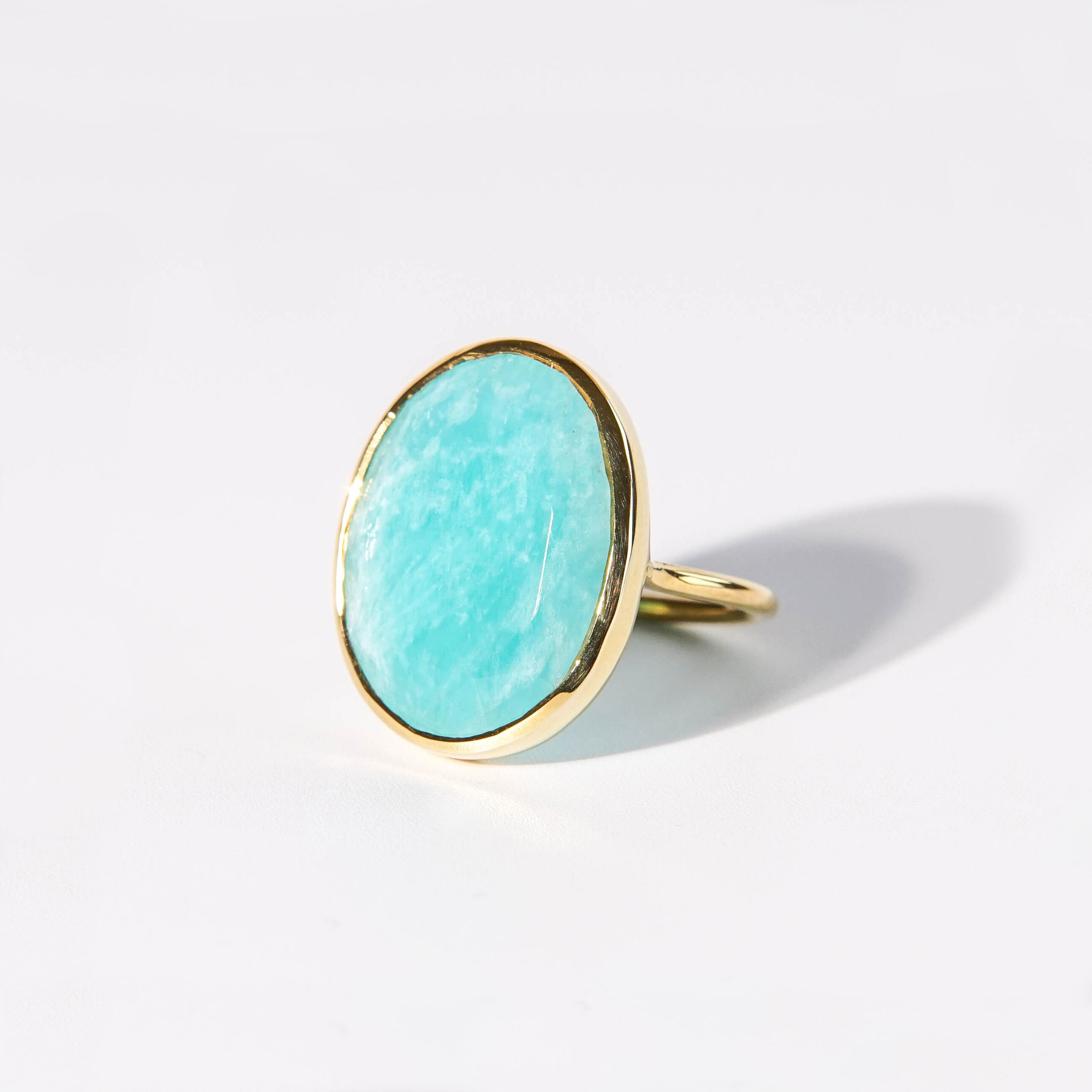 やわらかなブルーグリーンが印象的な、 アマゾナイトのリング。 どこか澄んだ空気を思わせるような色合いが、 手元に静かな明るさを添えてくれます。 グランシリーズならではの 贅沢な大きさの天然石は、 ひと目で惹かれる存在感がありながら、 アマゾナイトのやさしい色味によって 日常の装いにも自然に馴染みます。 つるりとした表面に広がる表情や、 ひとつとして同じもののない色の揺らぎも、 天然石ならではの魅力。 ふと手元を見たとき、 少し気持ちが整うような。 そんな感覚とともに、 日々の中でゆっくりと愉しんでいただきたいひとつです。 【素材】 ヴェルメイユ(SV925+18金マイクロコーティング) 天然石:アマゾナイト 【サイズ 】 10号 モチーフ:21.8X17.8mm 【石言葉】 心身を整え、行動をサポートする石 ※ご購入の前に【GUIDE】を必ずご一読お願いいたします。