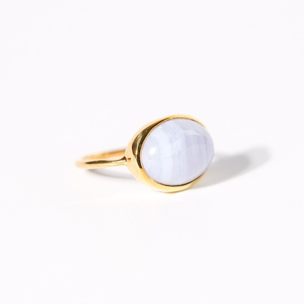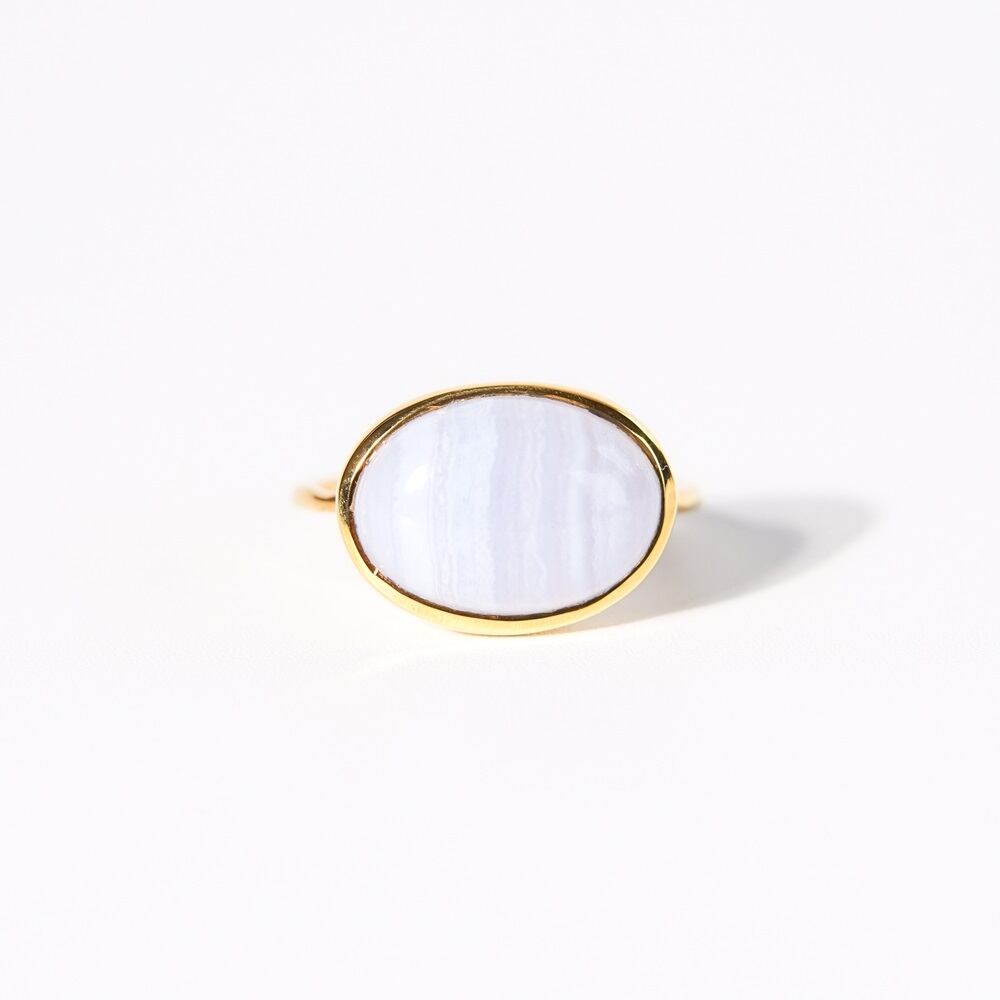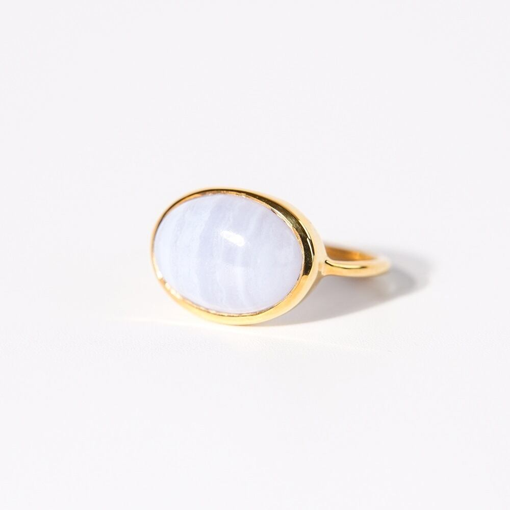 【素材】 ヴェルメイユ(SV925+18金マイクロコーティング) 天然石:ブルーレースアゲート 【サイズ 】 13号 モチーフ:15.7x11.6mm 【石言葉】 感情を穏やかにしてくれる石 ※ご購入の前に【GUIDE】を必ずご一読お願いいたします。