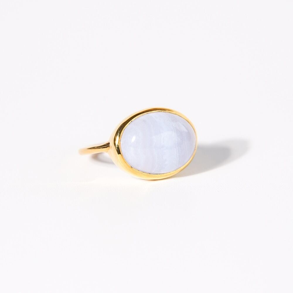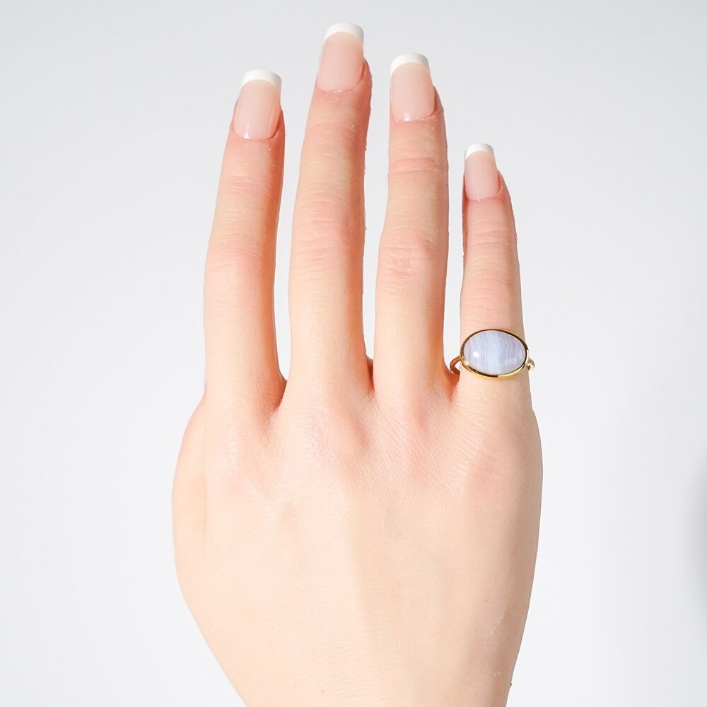 【素材】 ヴェルメイユ(SV925+18金マイクロコーティング) 天然石:ブルーレースアゲート 【サイズ 】 9号 モチーフ:15.7x12mm 【石言葉】 感情を穏やかにしてくれる石 ※ご購入の前に【GUIDE】を必ずご一読お願いいたします。