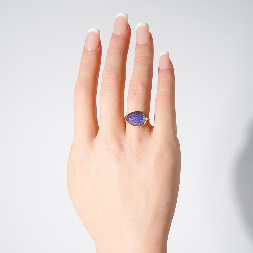 【素材】 ヴェルメイユ(SV925+18金マイクロコーティング) 天然石:タンザナイト 【サイズ 】 11号 モチーフ:16x11.4mm 【石言葉】 冷静さと正しい判断力を与え、成功へと導く石 【私のお気に入り】シリーズ 1つ1つが誰かの【私のお気に入り】リング。デザイナーが厳選した様々な天然石ピースをシンプルに仕立てたリングです。 人差し指にアクセントに身につけて、おしゃれに可愛らしくコーディネートしたり、少しずつ増やして重ね付けを楽しんだり、お守りの様に日々身に付けたり。 あなたの毎日に、お気に入りが増えますように。 ※天然石は1点、1点、色味・形・インクルージョン(内包物)が異なります。世界で1つしかない石をお楽しみ下さい。 天然石は石の成長過程によりできたクラック(亀裂・筋目)や、インクルージョン(内包物)がございます。 また制作上、カットによる天然石ならではの亀裂や、穴あけの欠け(石の硬度によるもの)もございますが、天然石ならではの表情になりますので、ご了承下さい。 ※ヴェルメイユとは、金属がSV925のものに金張りを施したもののことで、HLINEではK18(18金)を厚く金張りしており、他のコーティングに比べて?げにくくなっております。 お取り扱い、お手入れ方法は他の金属同様、水を避けて頂き、使用後は目の細かい布(メガネ拭きのような)で拭き上げてください。研磨剤が入っている布をご使用になると金の塗装が剥げてしまうので、ご注意ください。 ※大変繊細な作りとなっておりますので、無理に力を加えたりされないよう、お取扱いにはご注意願います。 ※こちらの商品は一つ一つ手作業で制作しておりますので、多少の風合いの違いはご了承下さい。