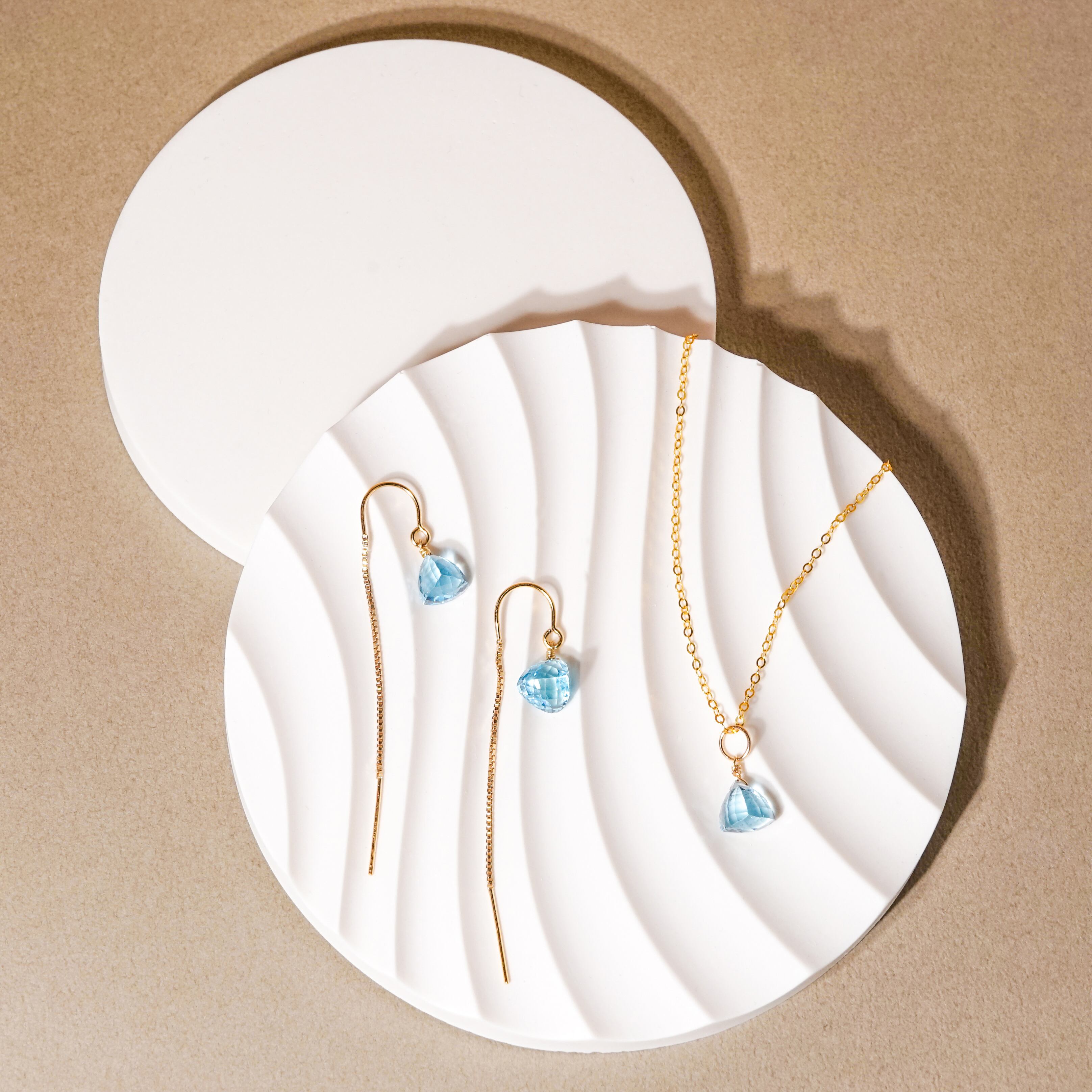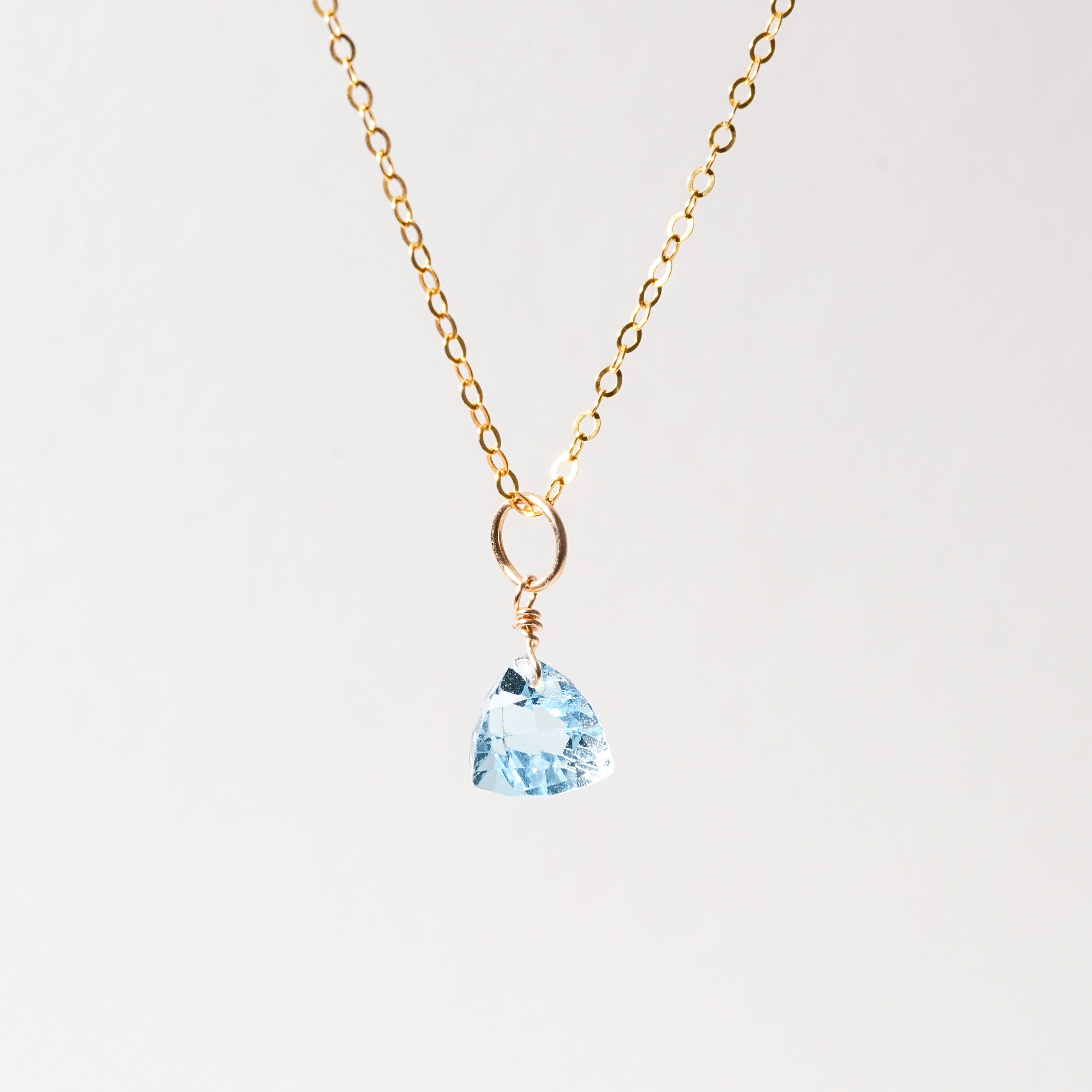 職人技が光るトリリアンカットは360度どんな角度からも光を取り込み輝くカットになり、さりげない発色も輝きが一層増すので、上品と可愛らしさが魅力的なデザインです。 シンプルにネックレスにお仕立てすることにより、肌にのる立体感のある天然石が程よい存在感です。 【サイズ 】 天然石(スイスブルートパーズ):7mm前後 ネックレス:〜45cm(スライド調整タイプ) 【素材】 ネックレスチェーン・金具:14kgf(ゴールドフィルド) 【石言葉】 自分に必要なものやチャンスを引き寄せる石 ※ご購入の前に【GUIDE】を必ずご一読お願いいたします。