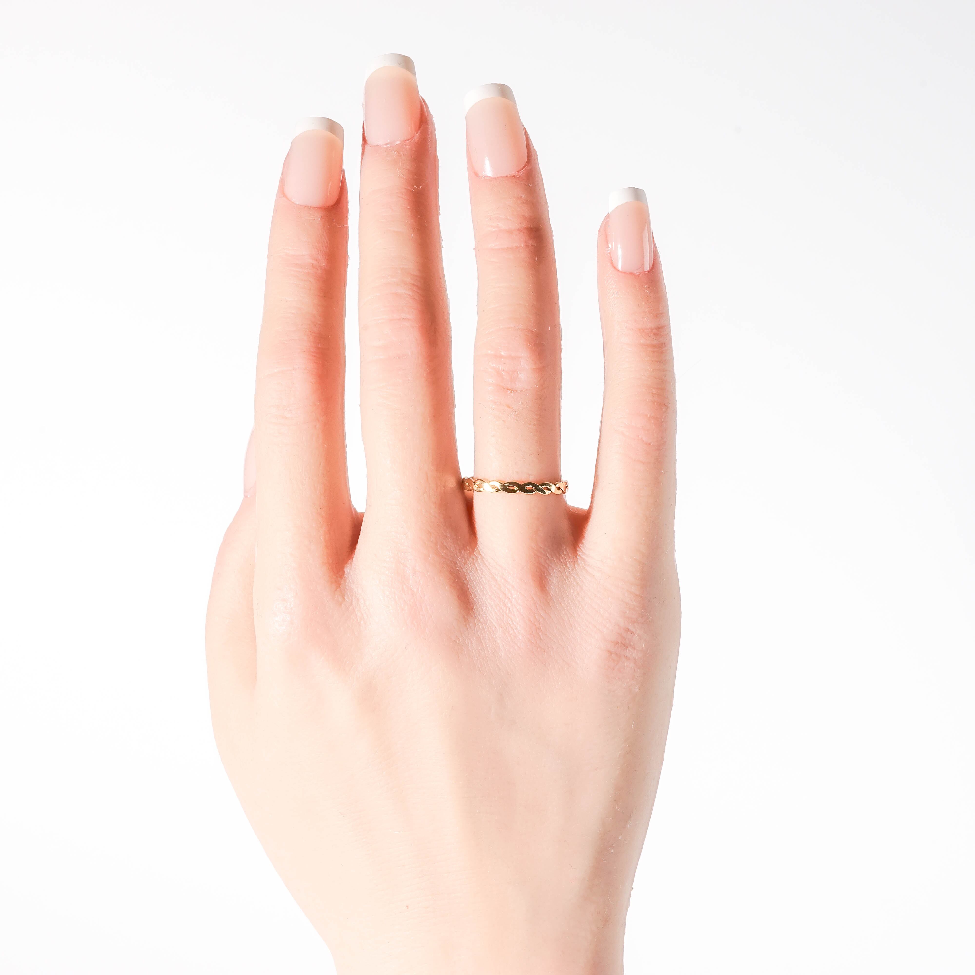 【Essence Collection(エッセンス コレクション)】 天然石をあえて使わず、フォルムとテクスチャーの美しさで魅せるリングライン。 シンプルで覚えやすい名前に込められたのは、日常に寄り添いながらも洗練を添える存在感。 重ねても、一つでも纏える、装いの“本質=エッセンス”となるコレクションです。 「スパイラルリング」― 細やかにねじれたラインが描く、軽やかなリズム。 らせん状に編み込まれた繊細なラインが、光を受けて立体的な表情を生み出すリング。シンプルでありながら動きのあるデザインは、指先に軽やかなニュアンスを添えます。 14kgfを使用することで、金属アレルギーのお持ちのお客様にも安心してお召しいただけるアイテムとなっております。重ね付けやファランジリングとしてもお召いただけます。 【素材】 SV925+18Kgf(18金ゴールドフィルド) 【サイズ 】 リングの太さ:1.8mm (リングサイズは選択タブからお選びいただけます) ※ご購入の前に【GUIDE】を必ずご一読お願いいたします。