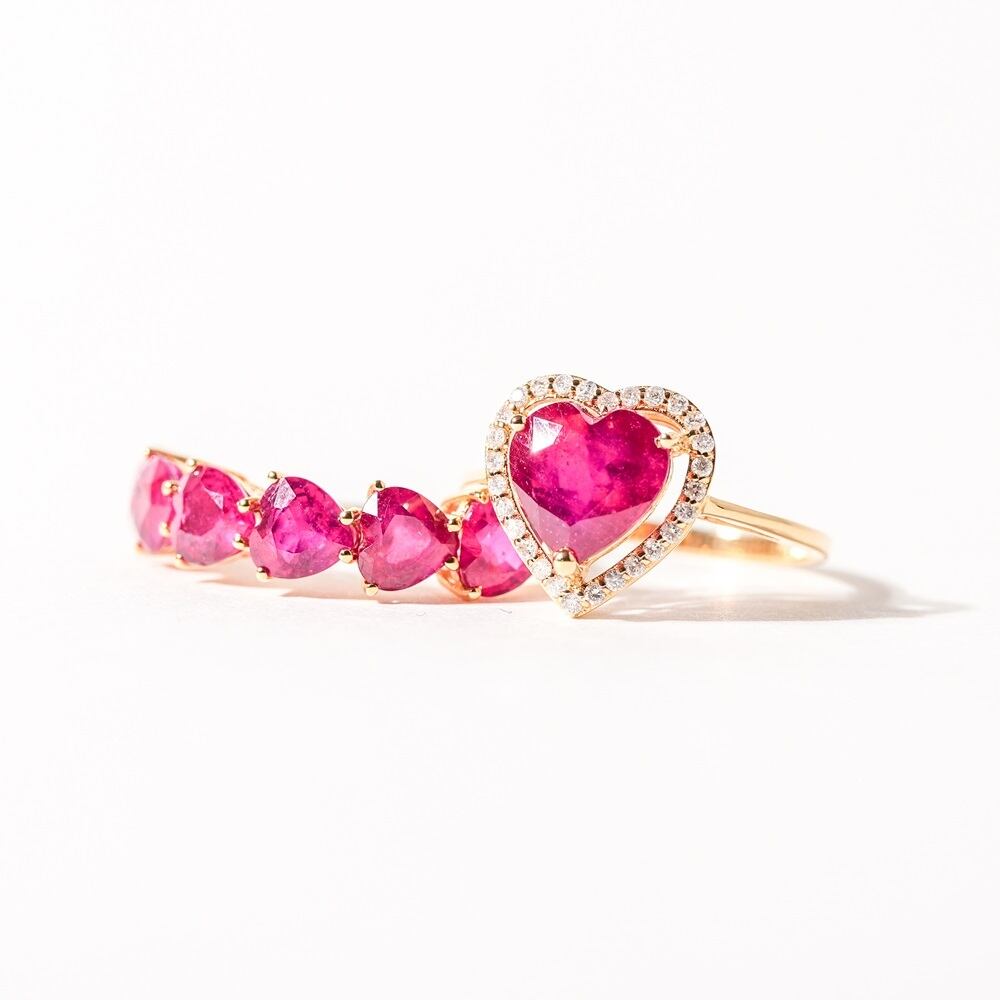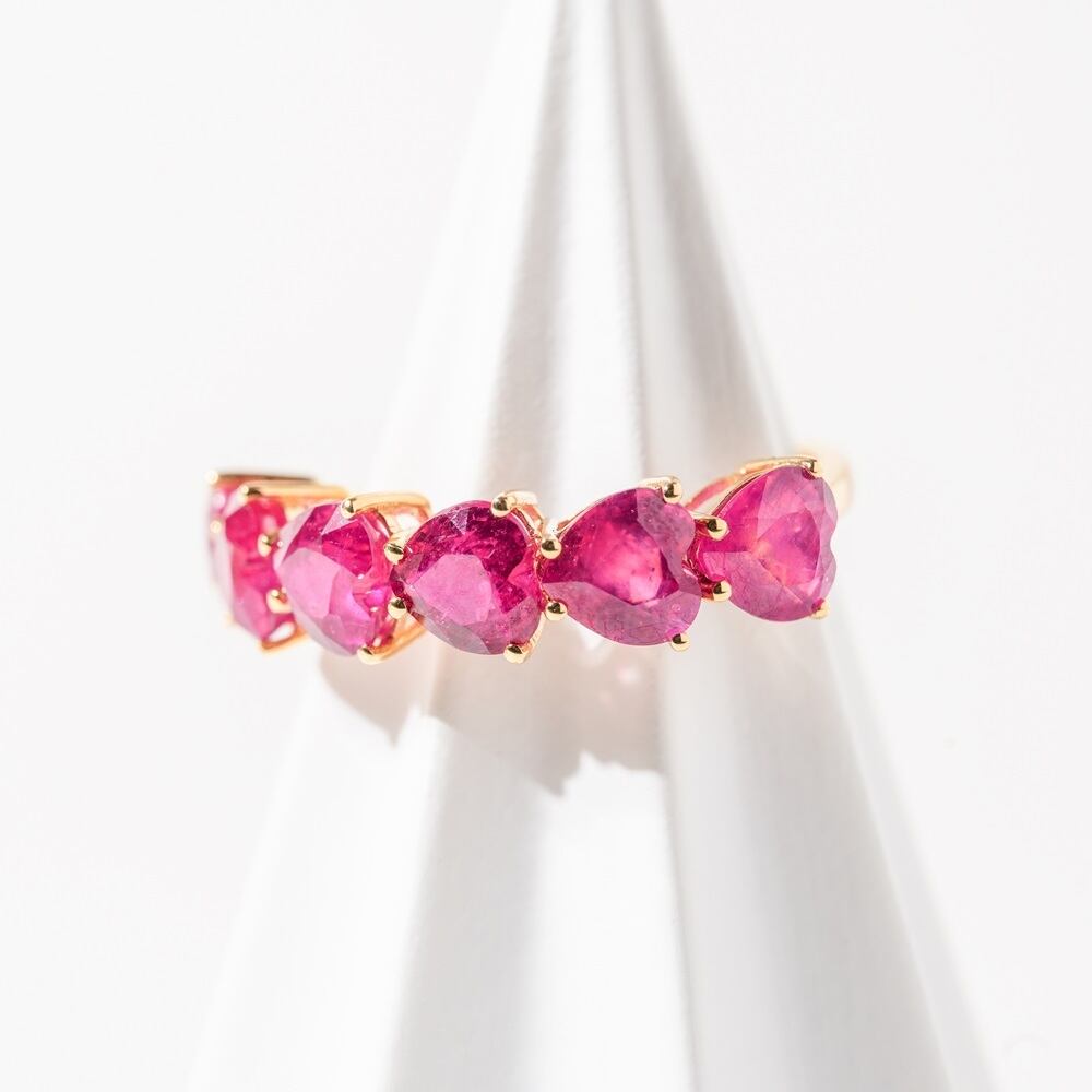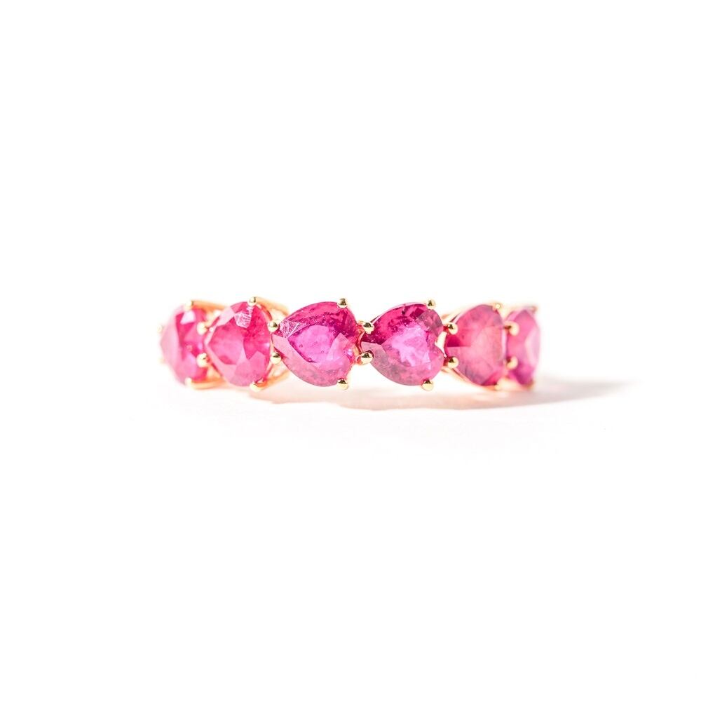ハートにカットした天然石ピースを贅沢に6連繋げたボリュームのあるリングです。 1本でも存在感があり、デザインがすっきりとしたストレートラインより他のリングとの合わせも相性良くお召いただけます。 人差し指や中指に着けてアクセントに、薬指には可愛らしくおしゃれにお召頂けます。一生モノとしてトレンドに左右されず、長くお召いただけます。 【素材】 天然石:ルビー(モザンビーク産) K18 (18金) 【サイズ 】 12号 モチーフ:5.4x31.2mm / 3.9ct 【石言葉】 勝利と情熱を象徴する石 ※こちらのリングはサイズ変更可能(無料)の商品となります。 サイズ変更は商品サイズの±3号までになります。ご希望のサイズを購入時の「備考欄」にご記入ください。サイズ変更の場合は納期は約1ヶ月半~いただきますので、ご了承ください。 ※ご購入の前に【GUIDE】を必ずご一読お願いいたします。