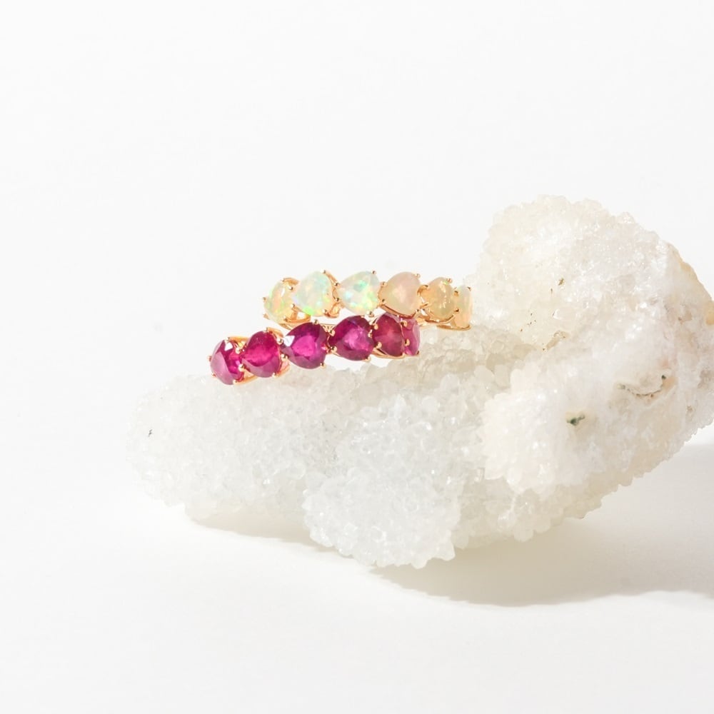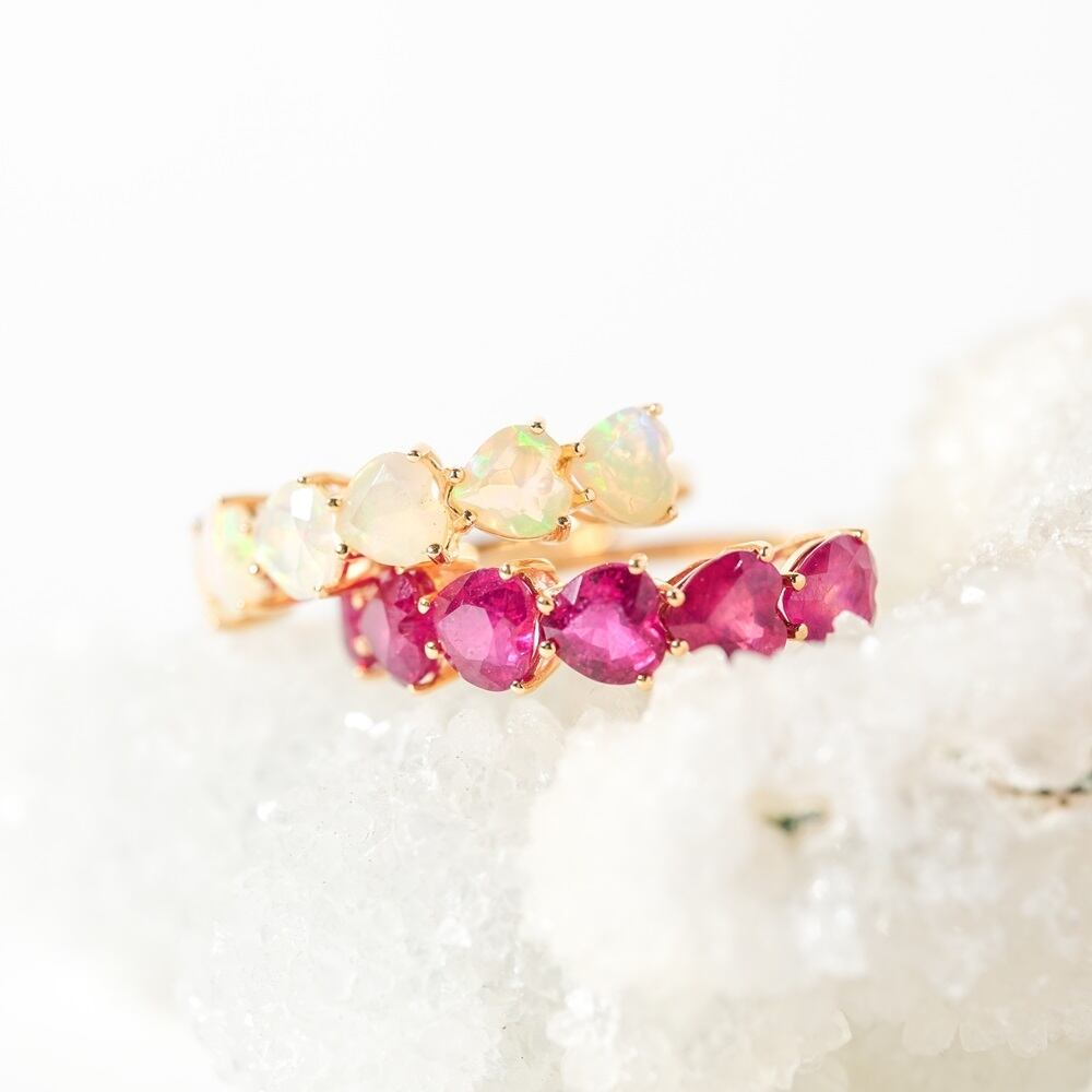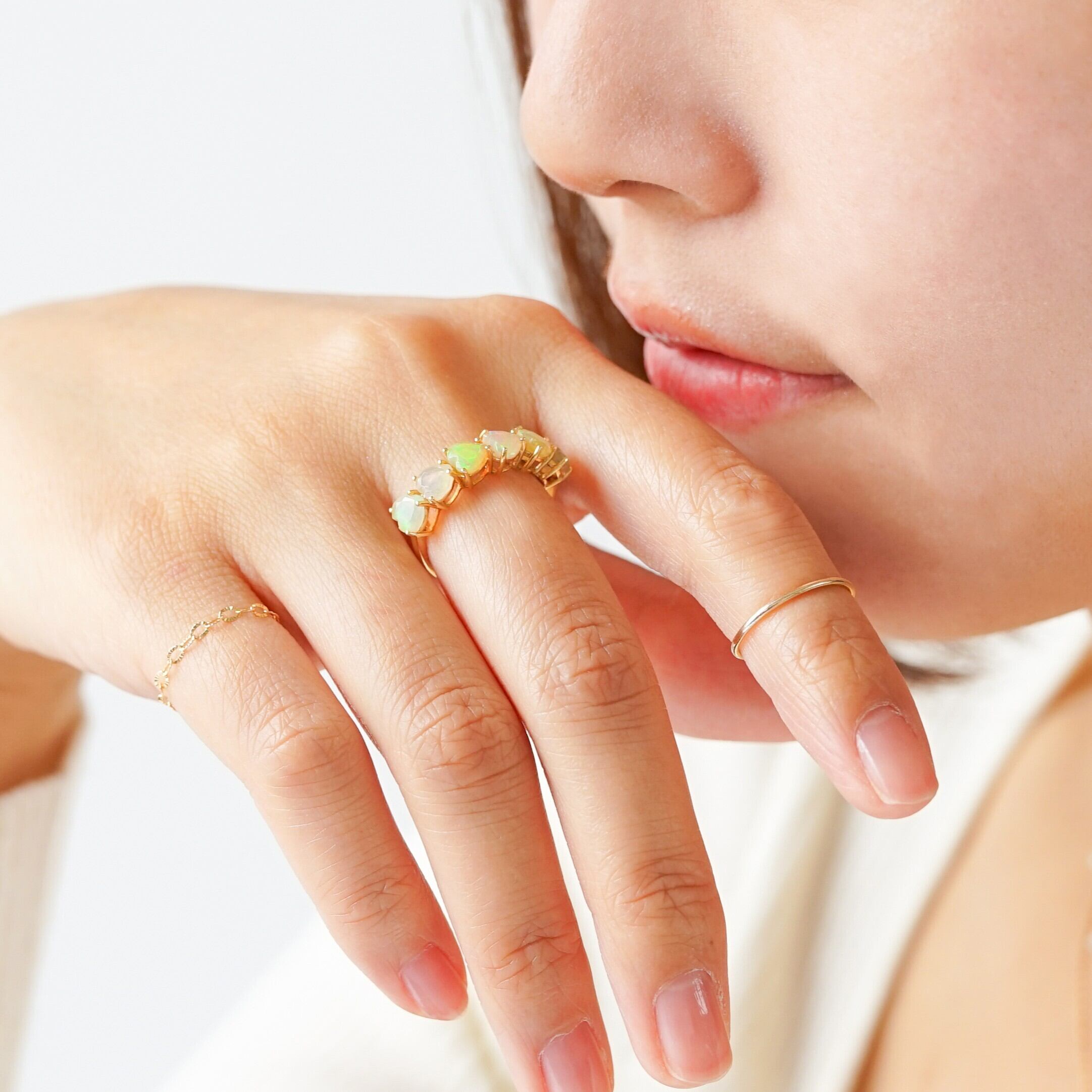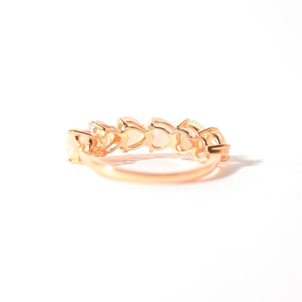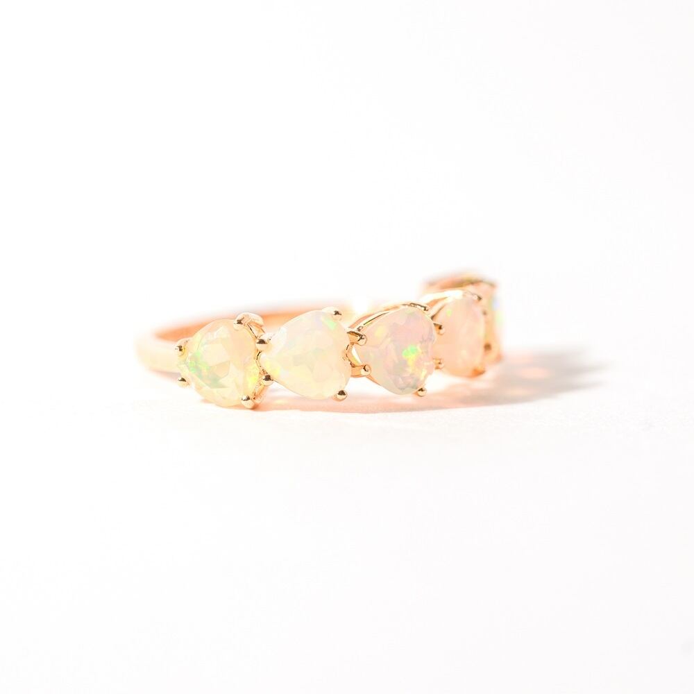 ハートにカットした天然石ピースを贅沢に6連繋げたボリュームのあるリングです。 1本でも存在感があり、デザインがすっきりとしたストレートラインより他のリングとの合わせも相性良くお召いただけます。 人差し指や中指に着けてアクセントに、薬指には可愛らしくおしゃれにお召頂けます。一生モノとしてトレンドに左右されず、長くお召いただけます。 【素材】 天然石:オパール(エチオピア産) K18 (18金) 【サイズ 】 12号 モチーフ:5.4x31.2mm / 1.75ct 【石言葉】 希望の象徴・幸運を招く石 ※こちらのリングはサイズ変更可能(無料)の商品となります。 サイズ変更は商品サイズの±3号までになります。ご希望のサイズを購入時の「備考欄」にご記入ください。サイズ変更の場合は納期は約1ヶ月半~いただきますので、ご了承ください。 ※ご購入の前に【GUIDE】を必ずご一読お願いいたします。