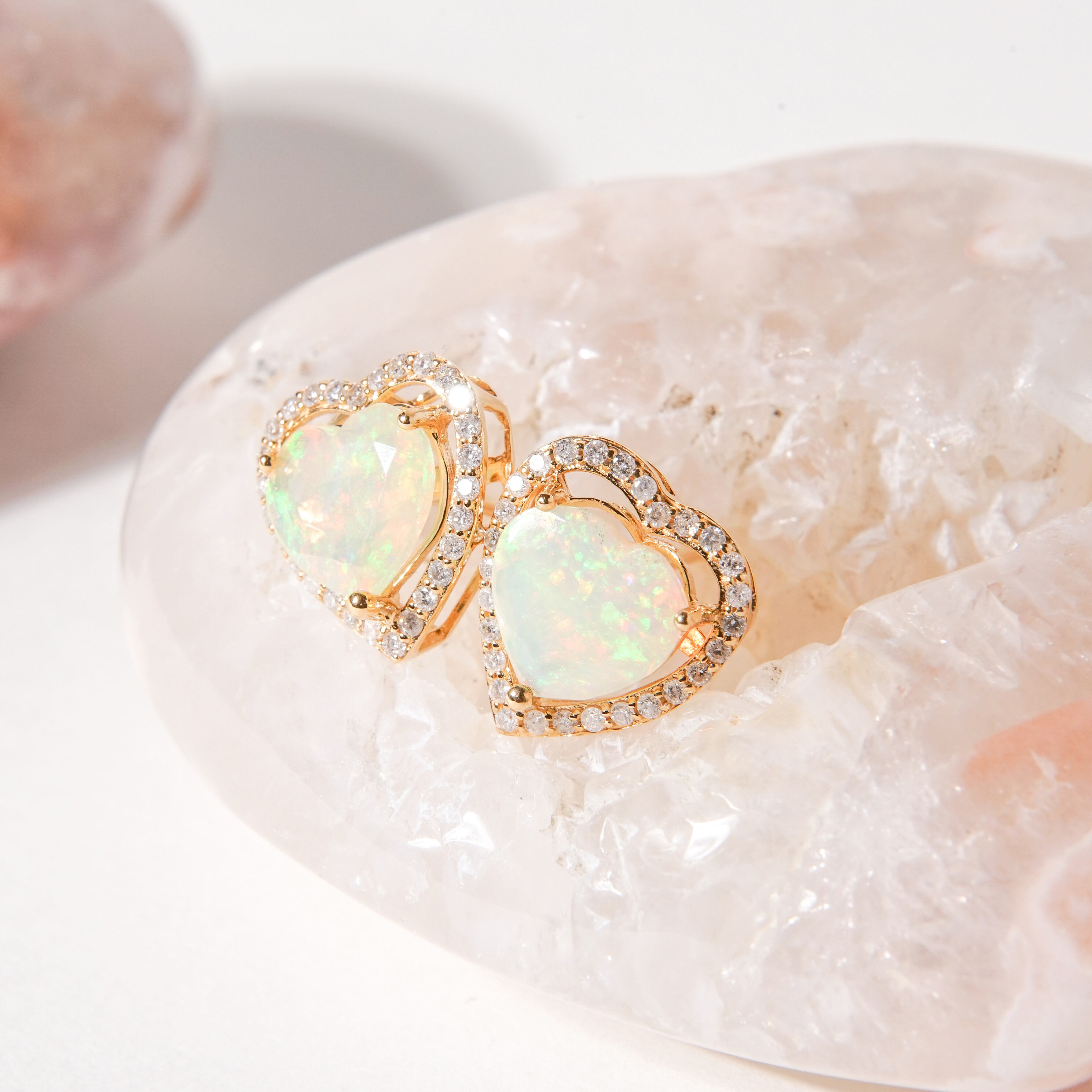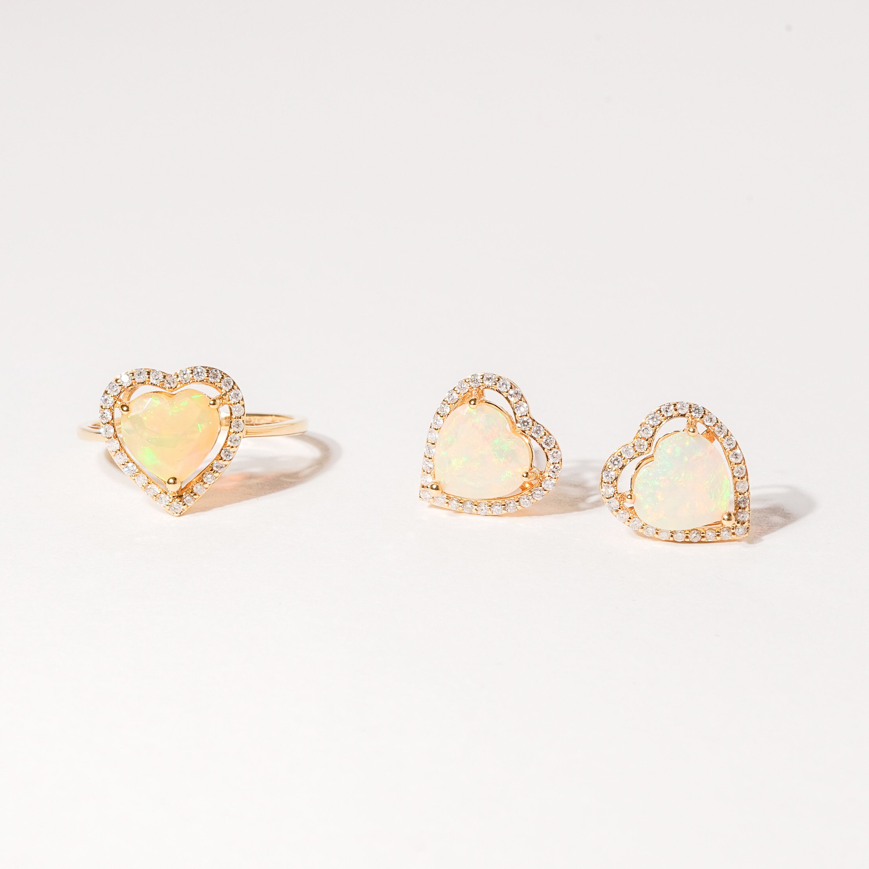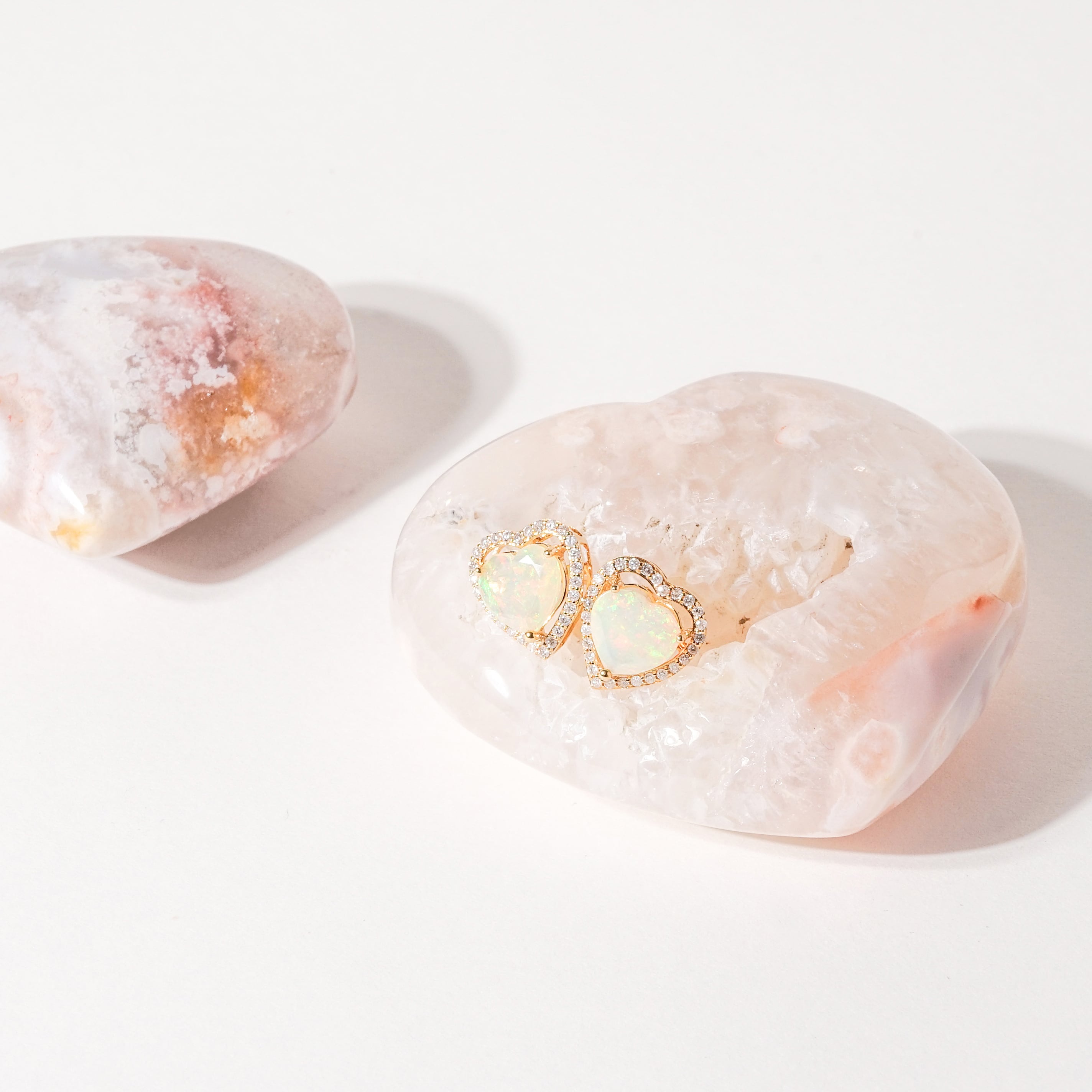 1点モノの厳選された天然石のピースを贅沢にダイヤモンドで取り囲んだ少しレトロで可愛らしいピアスです。ハートの可愛らしいモチーフを大人可愛くお召いただけるデザインになっております。 美しいカットを最大限生かしたデザインになっており、一生モノとしてトレンドに左右されず、長くお召いただけます。 【素材】 天然石:オパール(エチオピア産)・ダイヤモンド K18 (18金) 【サイズ 】 モチーフ:11.7x11.7mm オパール:4.8ct ダイヤモンド:0.3ct 【石言葉】 オパール:希望の象徴・幸運を招く石 ※ご購入の前に【GUIDE】を必ずご一読お願いいたします。