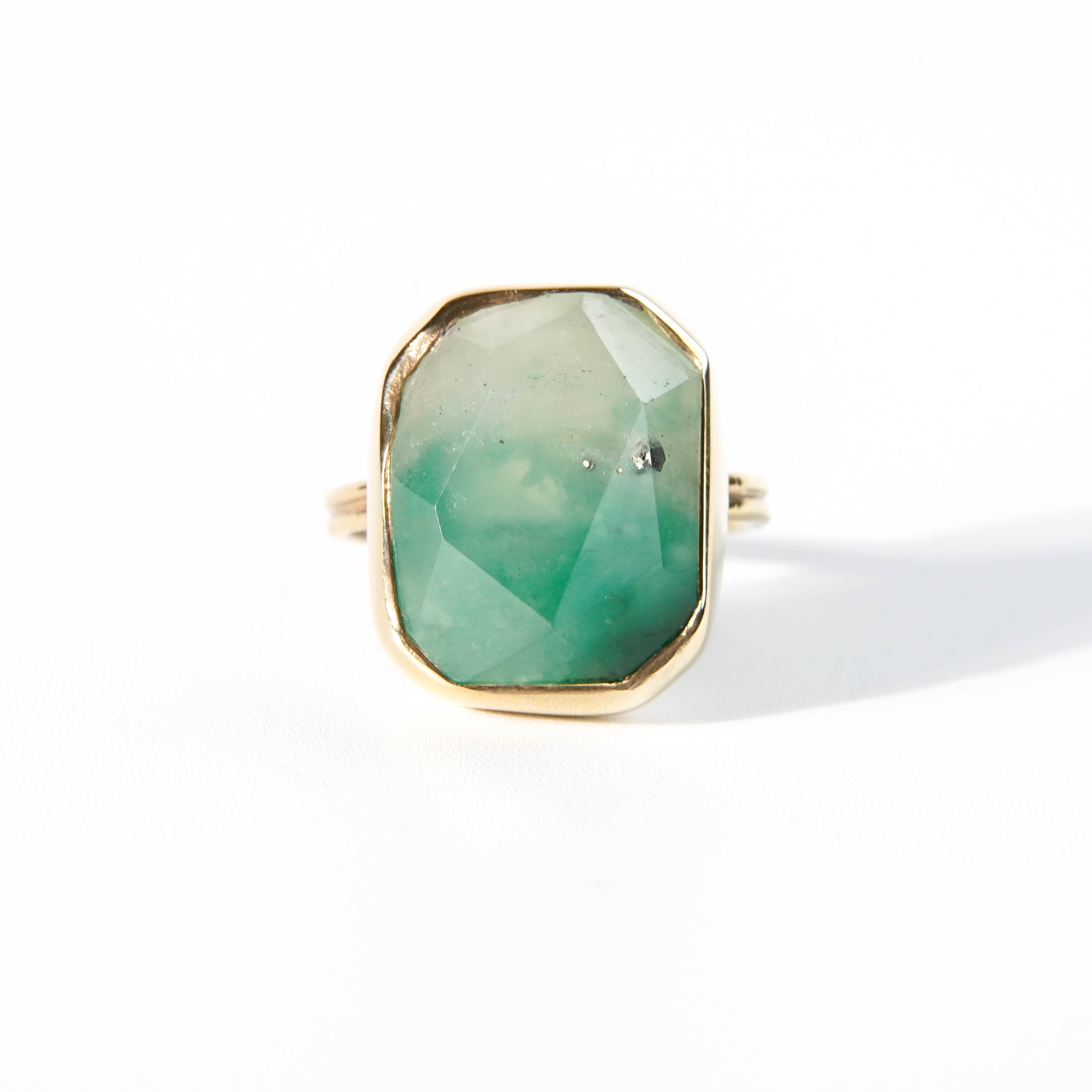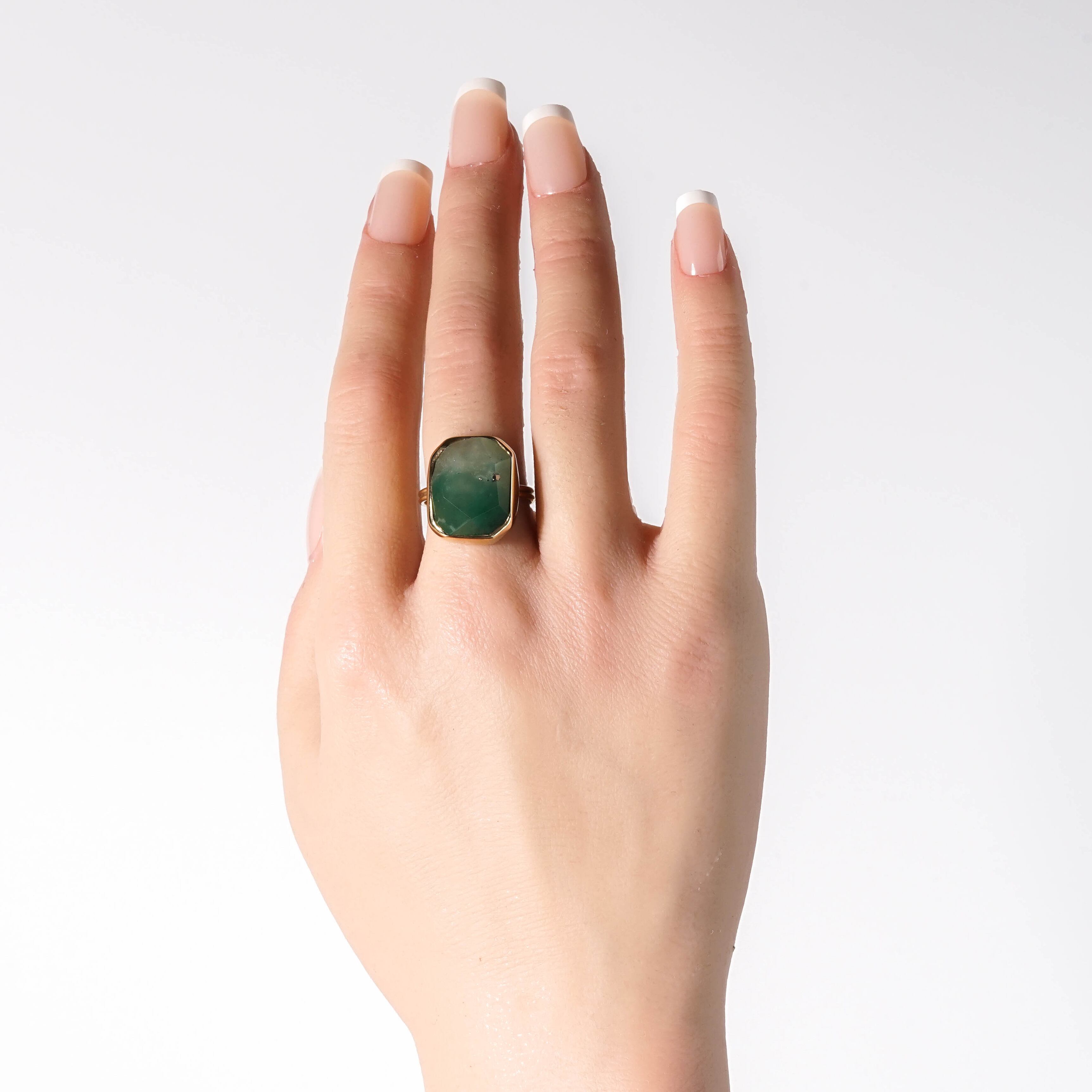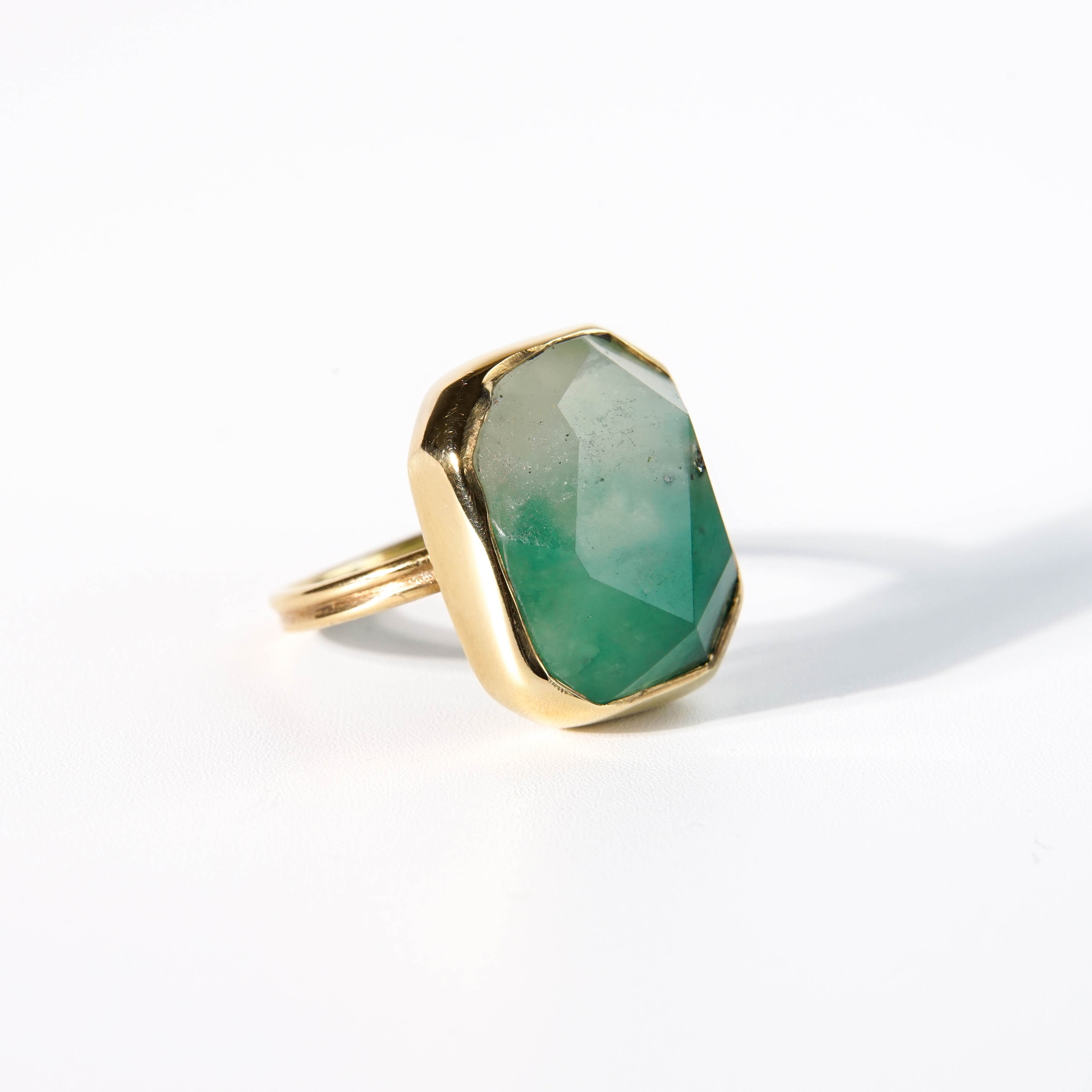 いろんな表情を見せてくれるアゲートの中でも、静かな草原が広るような風景に見えるアートピースです。丸いお月様にも見えるメタリックなインクルージョン(内包物)が物語を感じさせます。 【素材】 天然石:アゲート ヴェルメイユ(SV925+18金マイクロコーティング) 【サイズ 】 フリーサイズ (推奨 9~15号) モチーフ:18.5x15.4mm 【石言葉】 魔除けの石 ※ご購入の前に【GUIDE】を必ずご一読お願いいたします。
