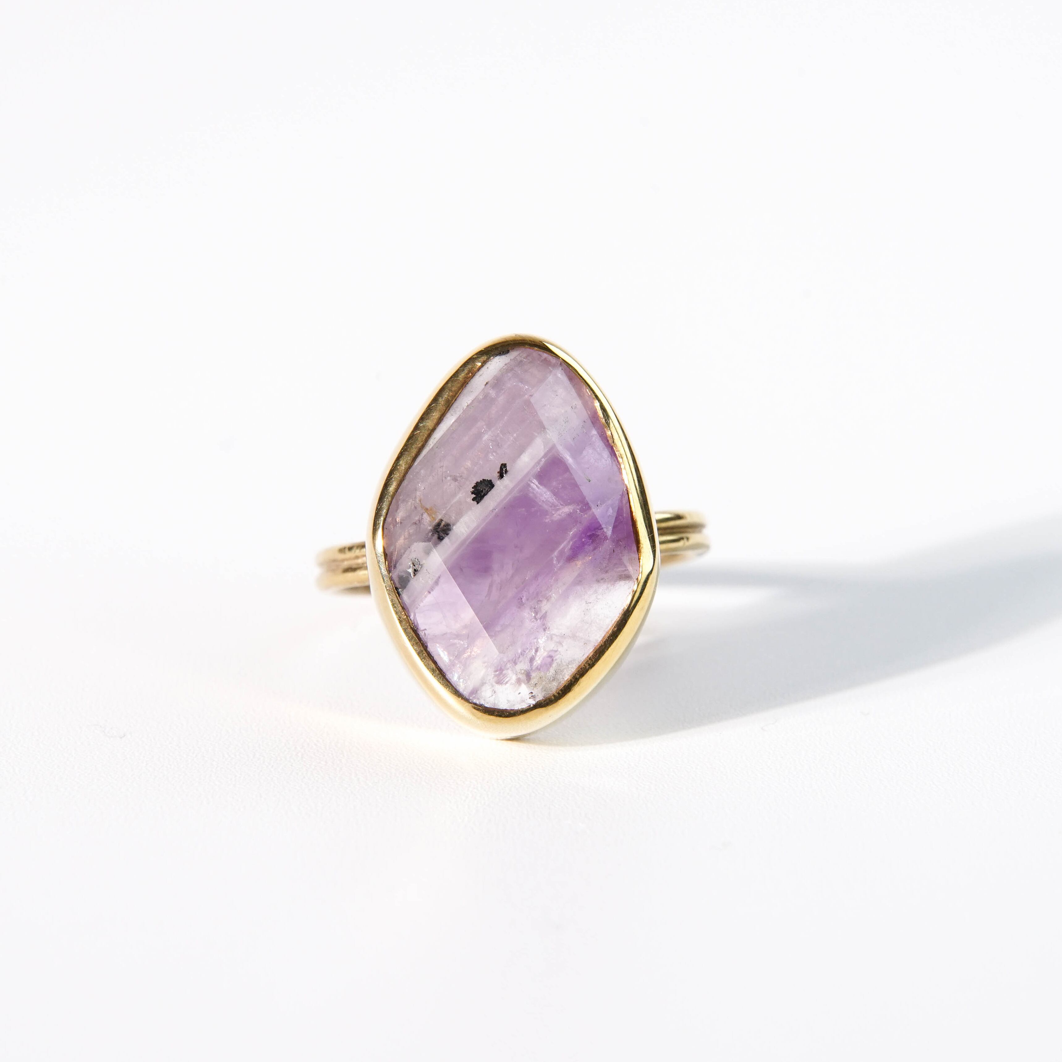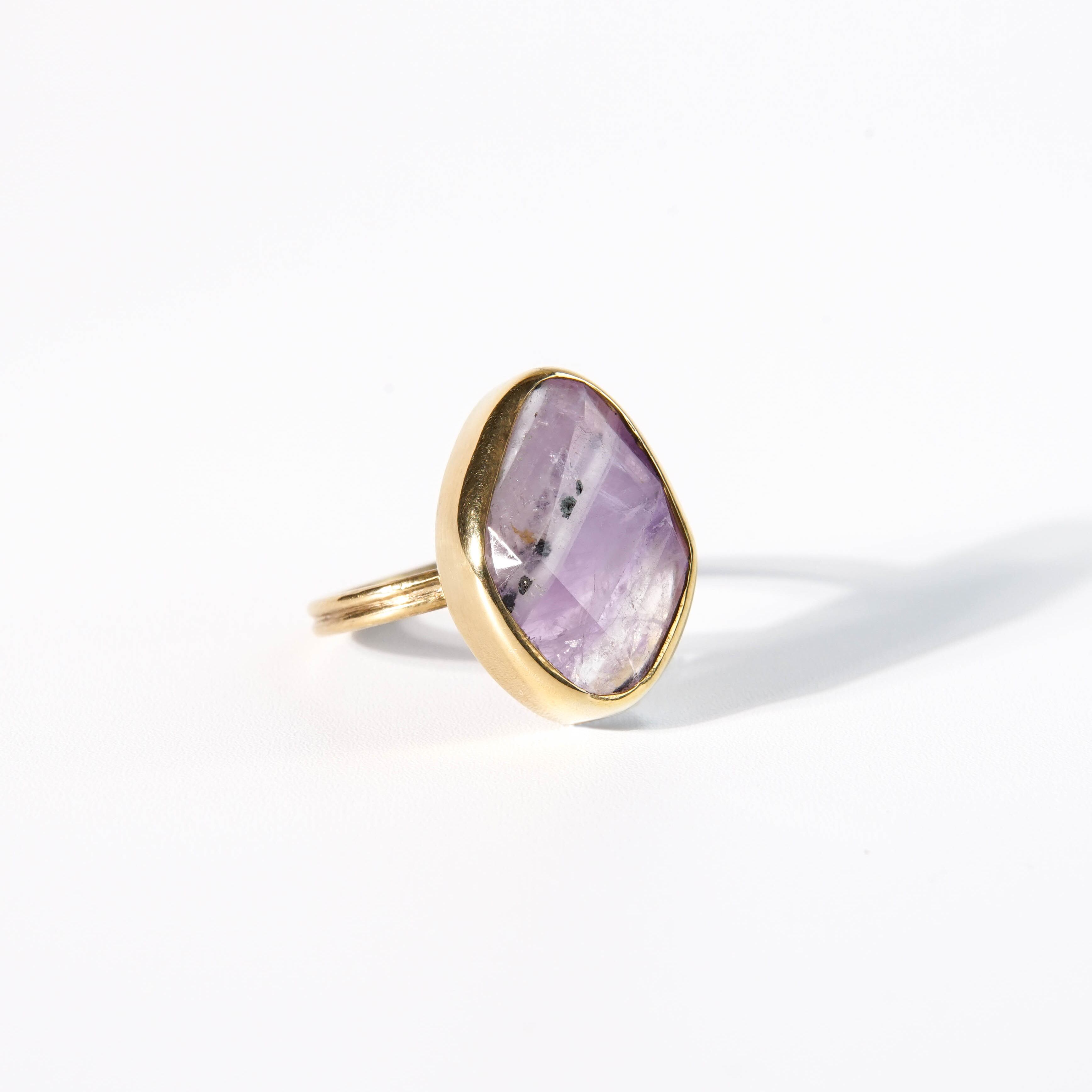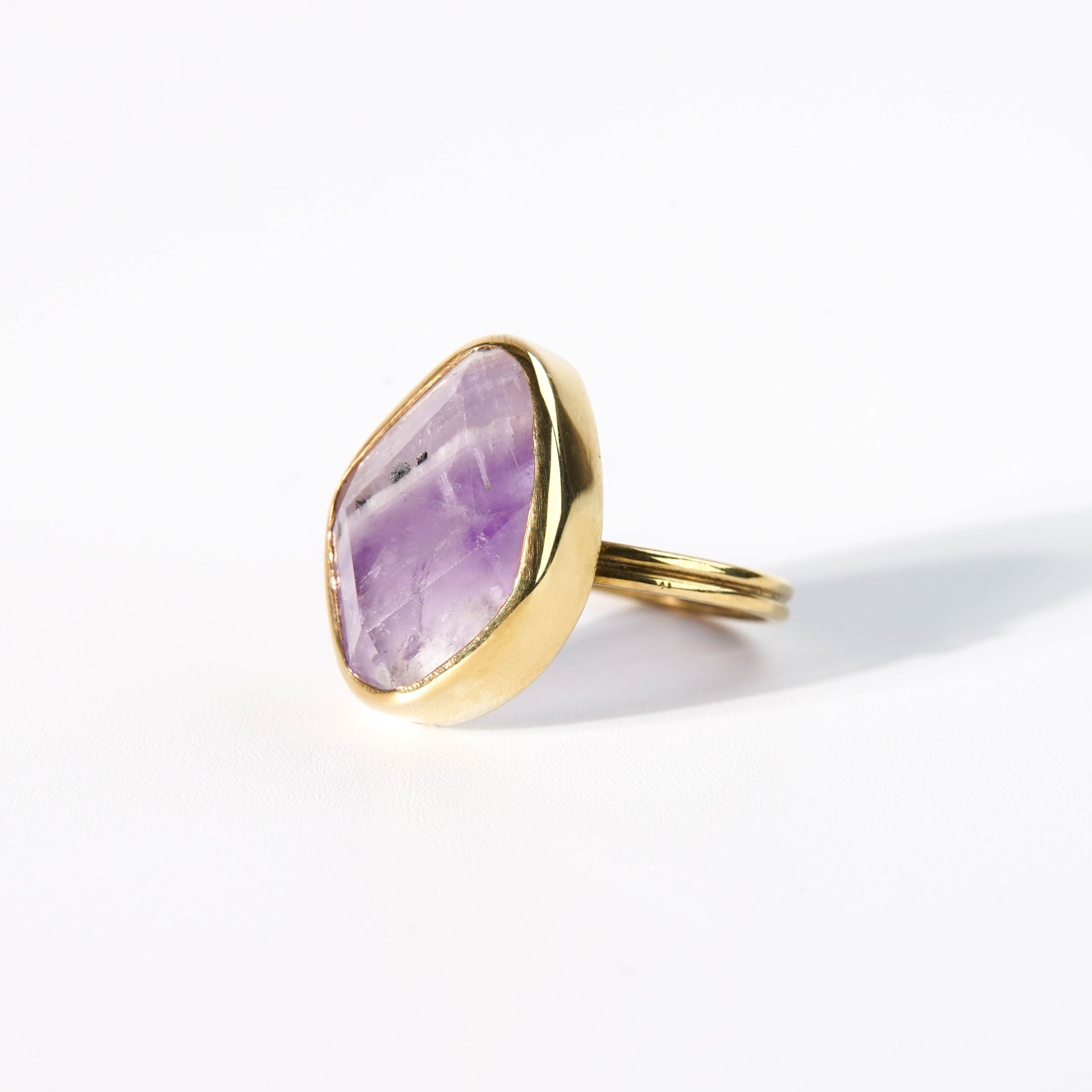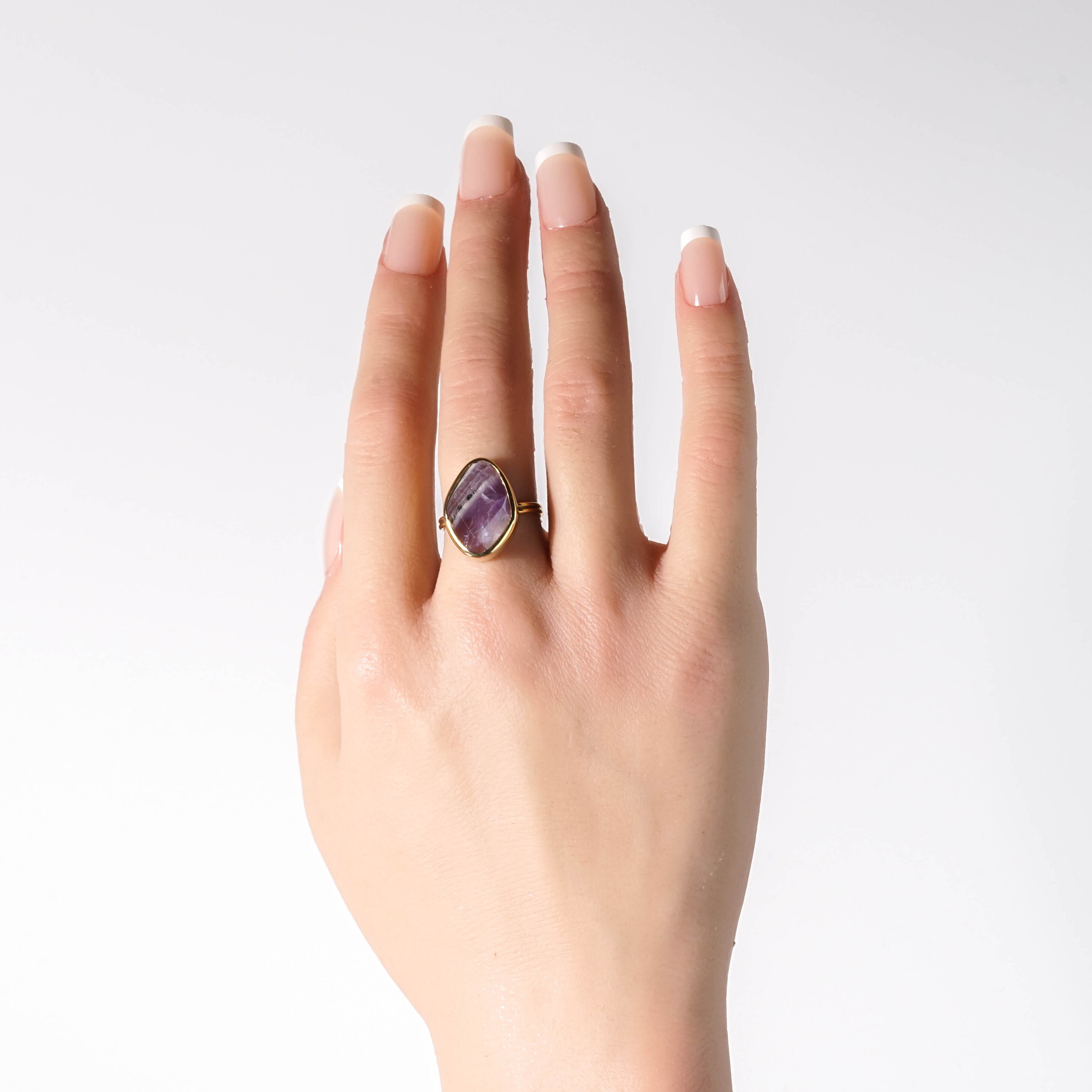 普段目にするアメシストとは違った、豊かな表情の天然石ピース。濃淡の美しさと、スタイリッシュな模様はいろんな表情を見せてくれます。 【素材】 天然石:アメシスト ヴェルメイユ(SV925+18金マイクロコーティング) 【サイズ 】 フリーサイズ (推奨 9~15号) モチーフ:18.4x13.4mm 【石言葉】 隠れた魅力を引き出し、開花させてくれる魅力開花の石 ※ご購入の前に【GUIDE】を必ずご一読お願いいたします。