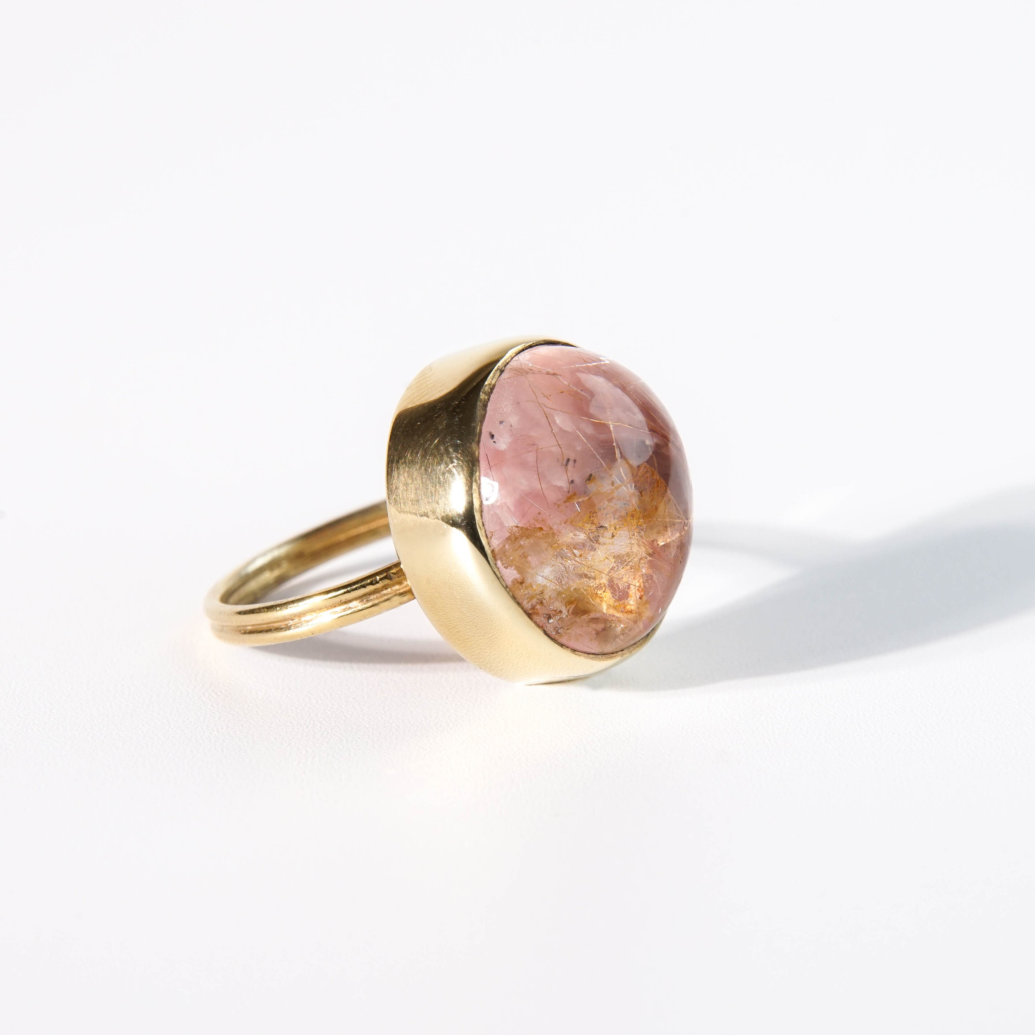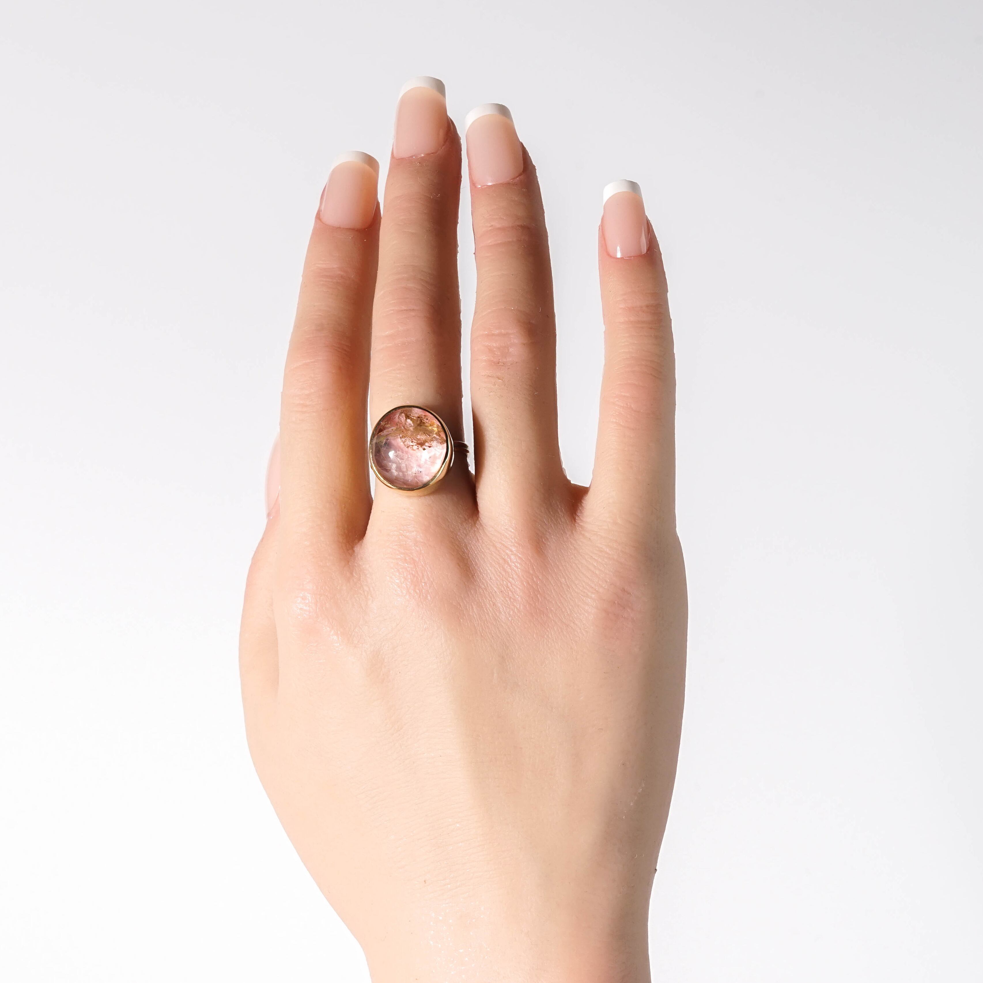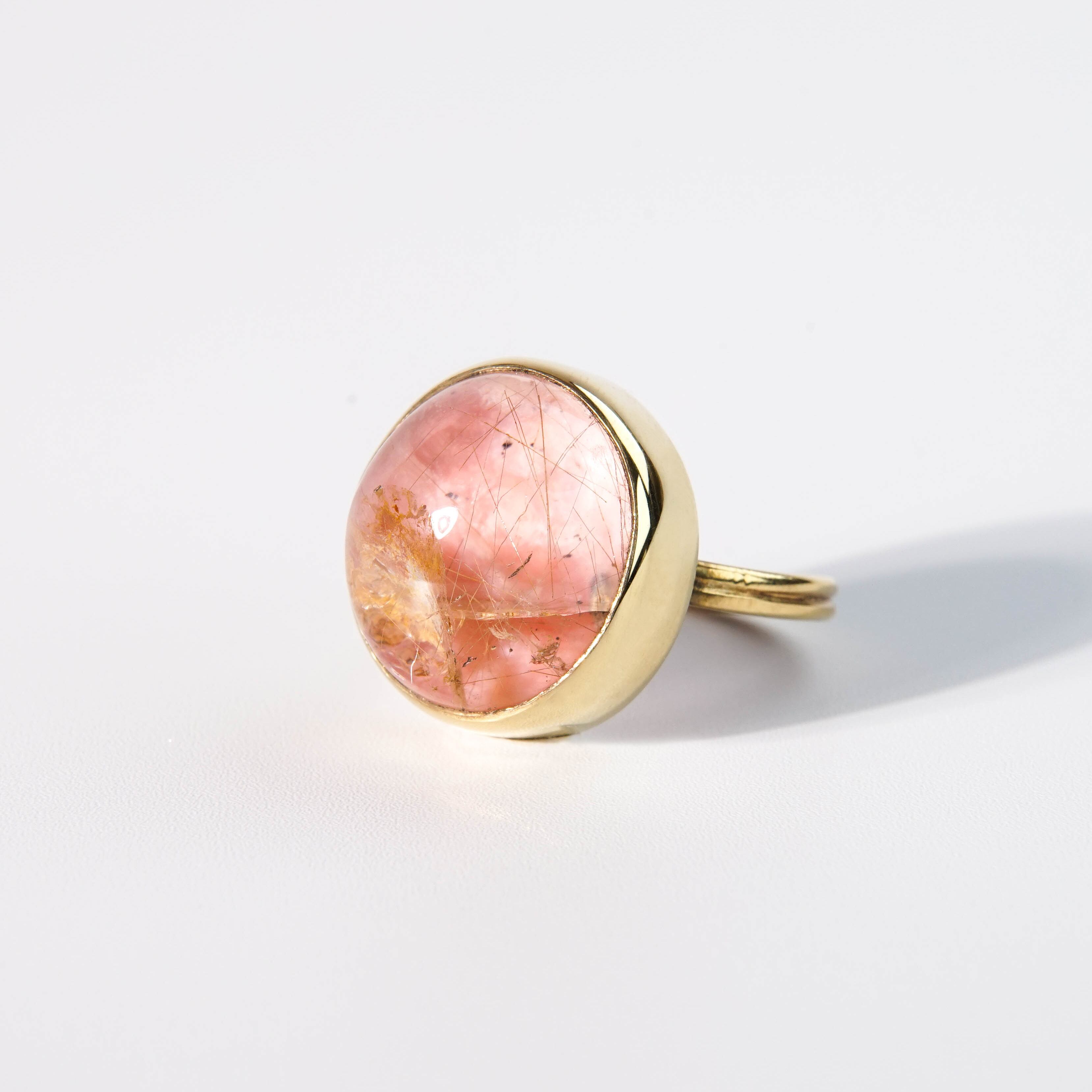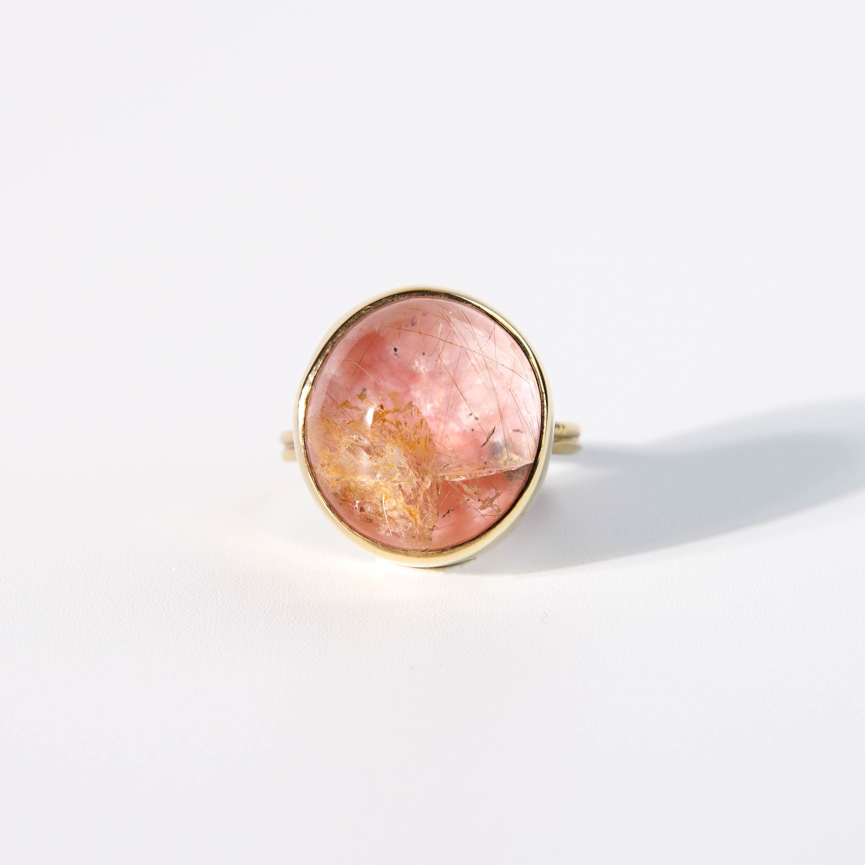 柔らかな色合いのピンクオパールと、透明感の中にも印象的なルチル(針)が入ったルチルクォーツの2つの石を一緒に留めた珍しいリングです。 【素材】 天然石:ピンクオパール x ルチルクォーツ ヴェルメイユ(SV925+18金マイクロコーティング) 【サイズ 】 フリーサイズ (推奨 9~15号) モチーフ:16.9x15.7mm ※ご購入の前に【GUIDE】を必ずご一読お願いいたします。