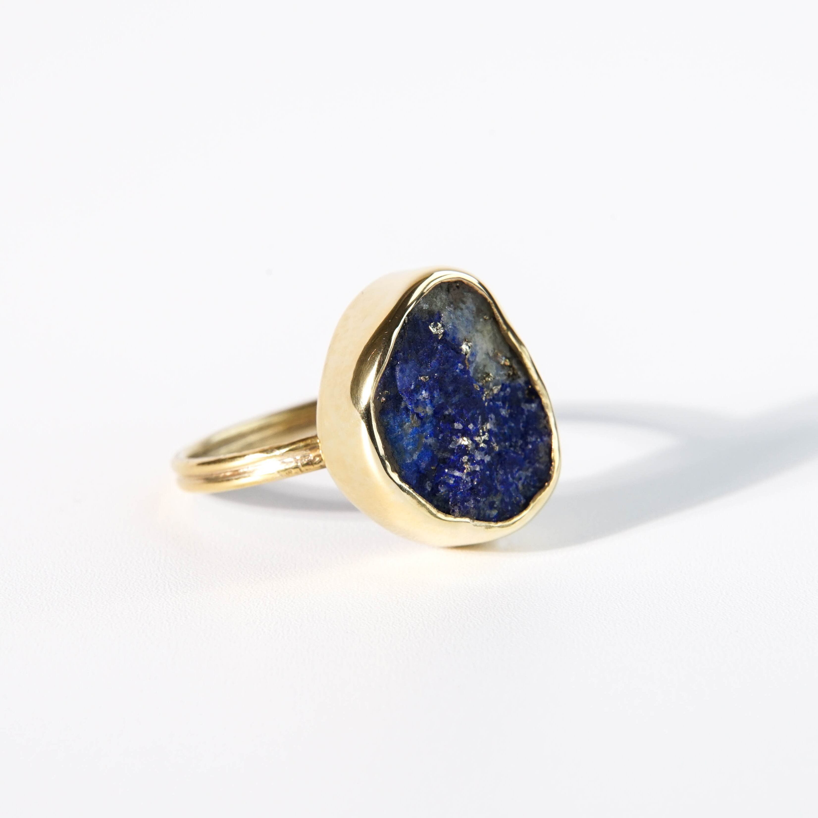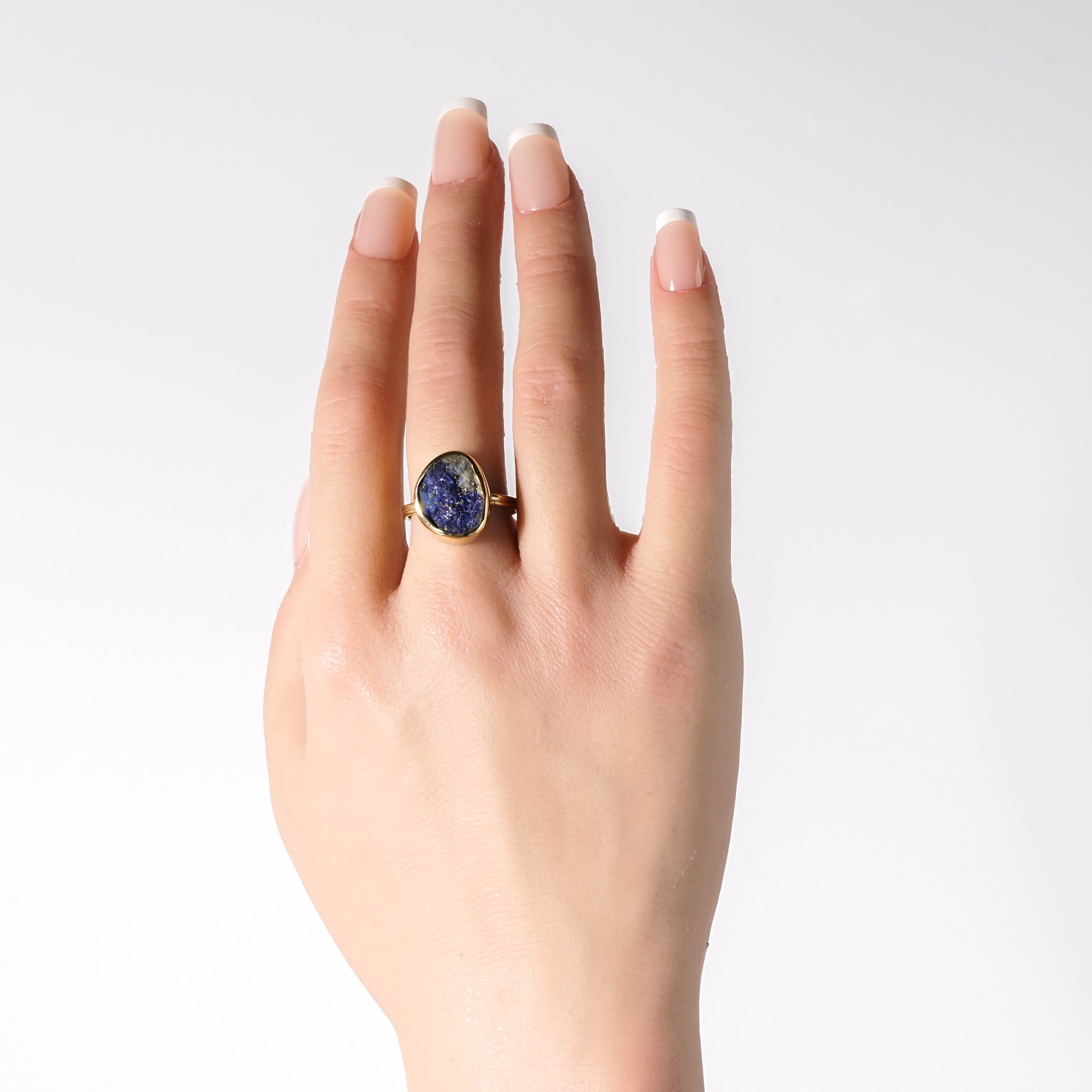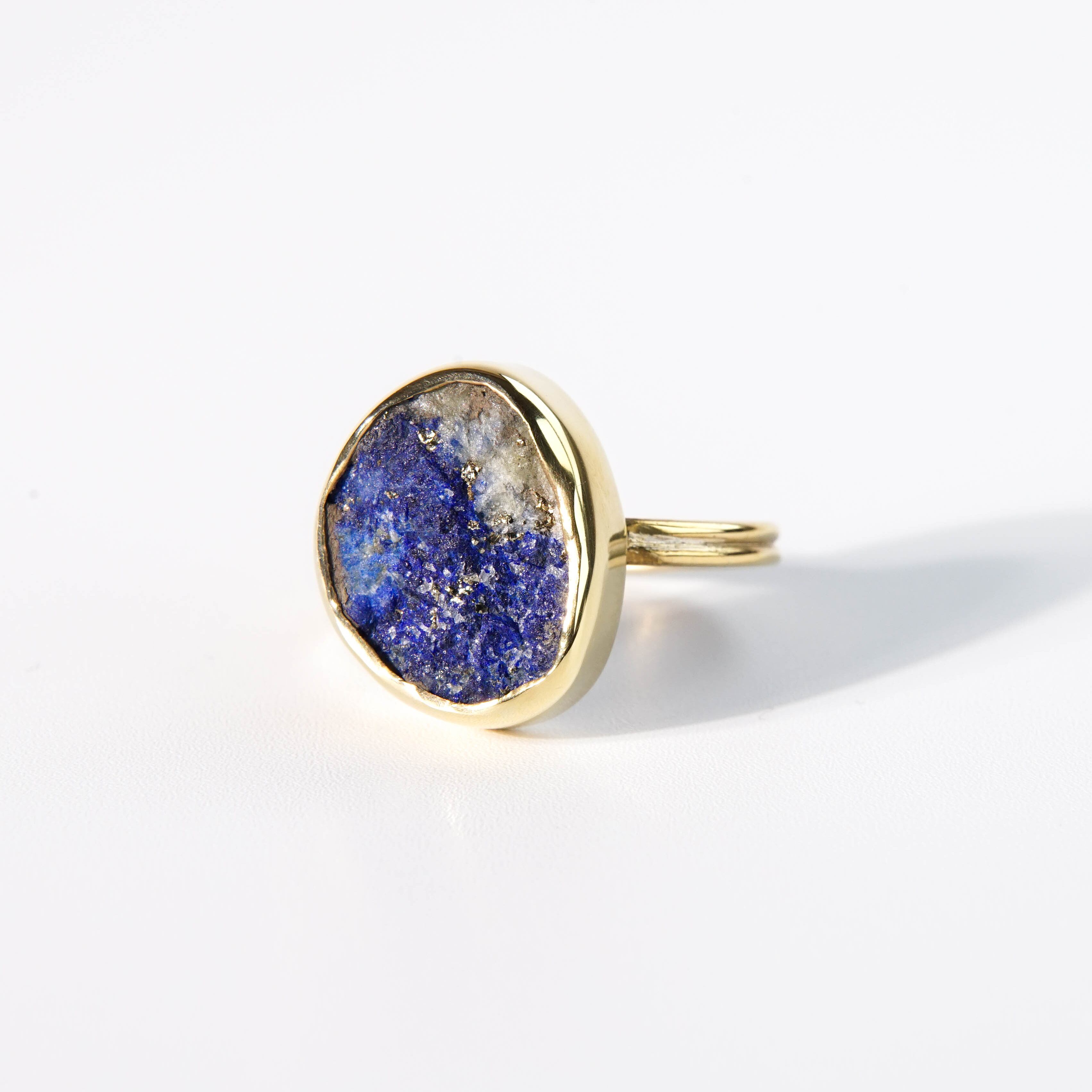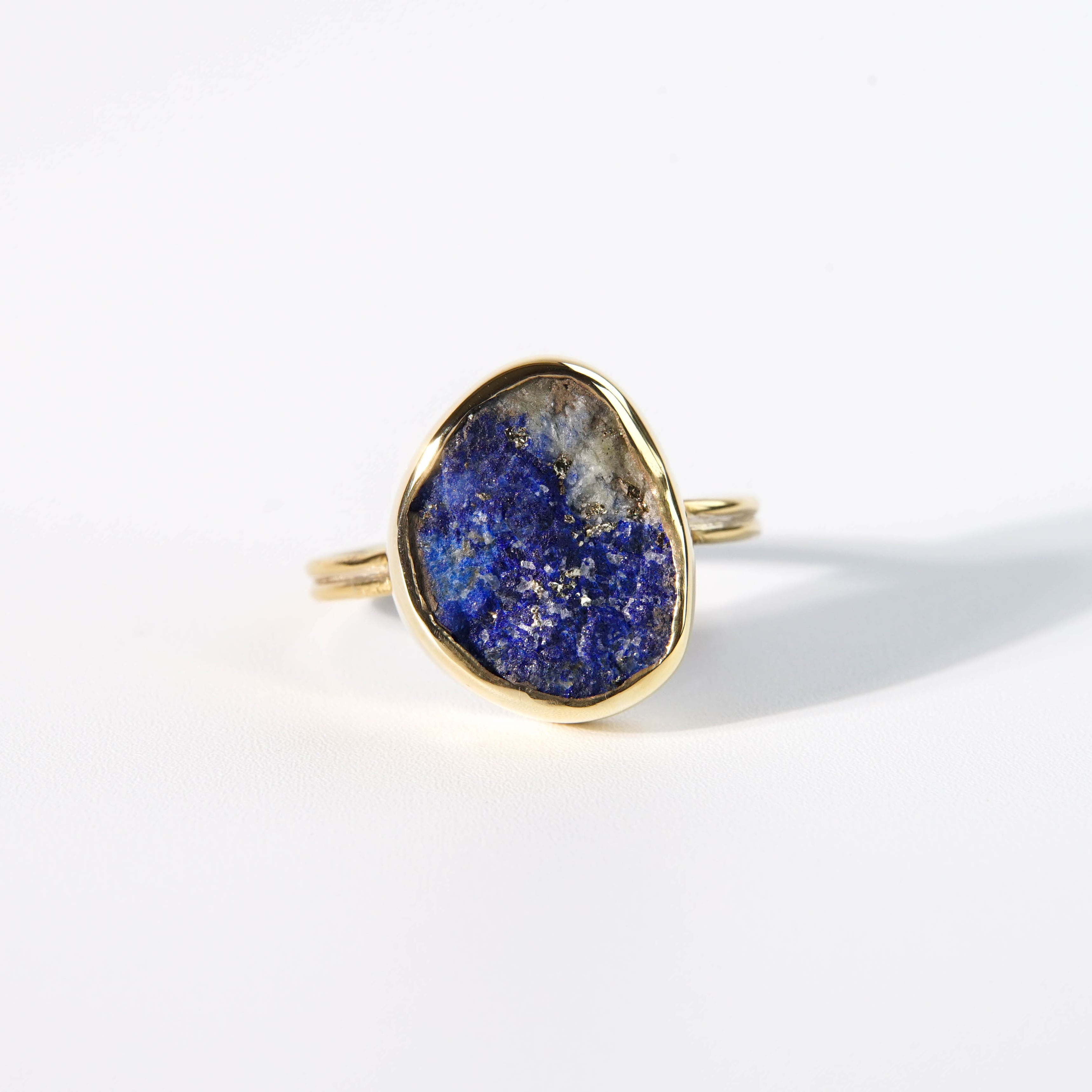 深く鮮やかな群青の中に、金色のきらめきが美しいラピスラズリは、通常研磨されてしまう表情を自然のまま活かした天然石のピースになります。 【素材】 天然石:ラピスラズリ ヴェルメイユ(SV925+18金マイクロコーティング) 【サイズ 】 フリーサイズ (推奨 9~15号) モチーフ:16.4x12.7mm 【石言葉】 あらゆる幸運を引き寄せる聖なる石 ※ご購入の前に【GUIDE】を必ずご一読お願いいたします。