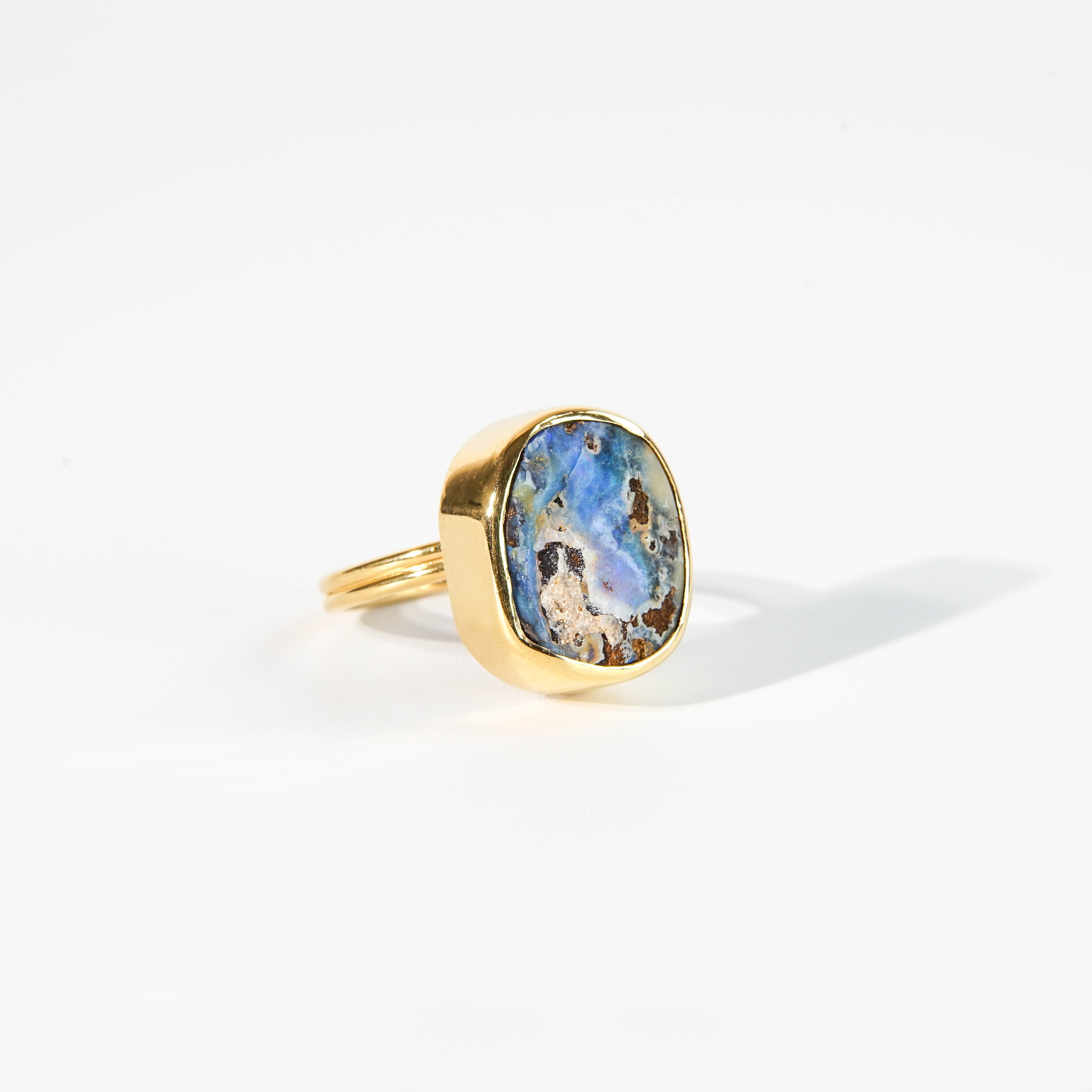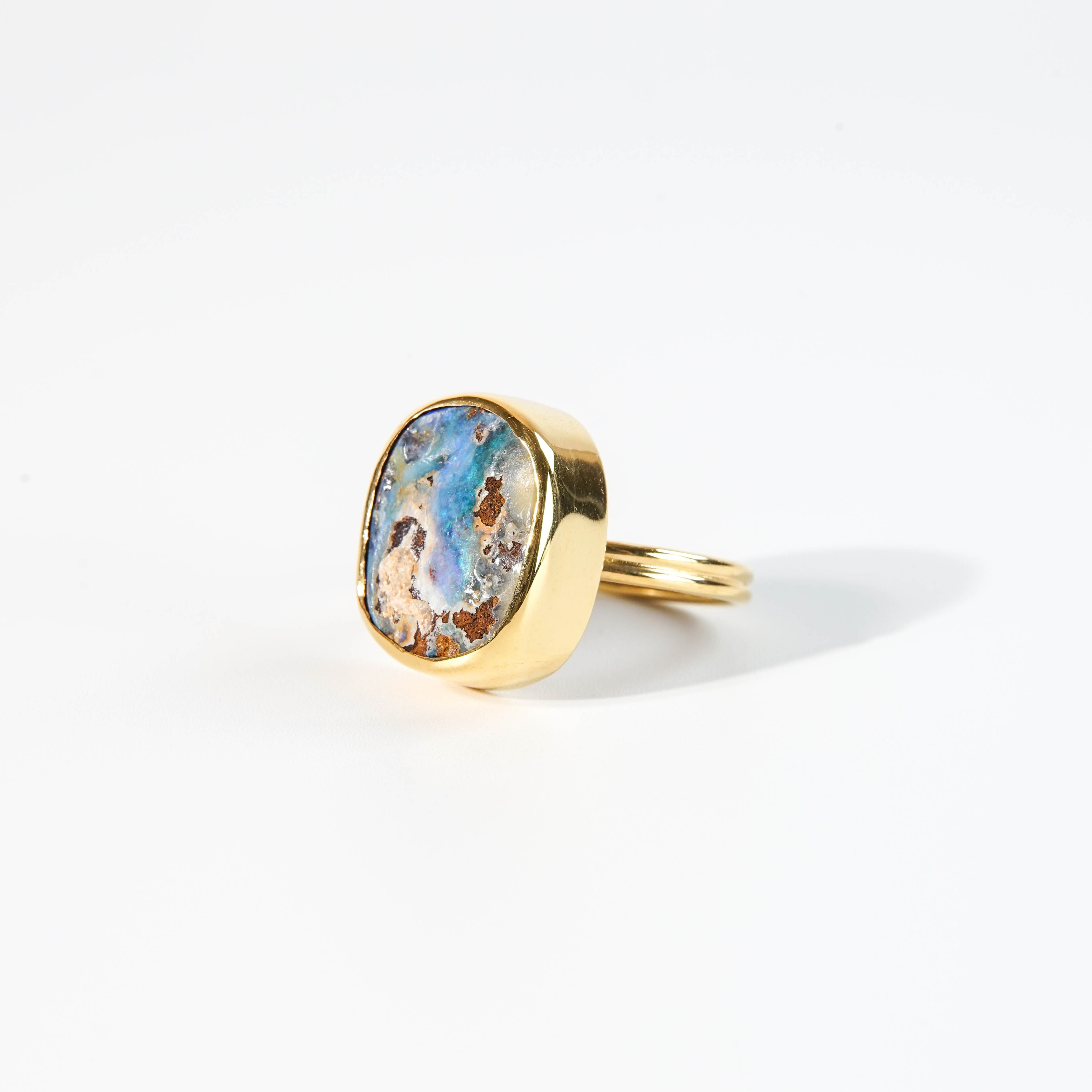 ボルダーとは岩の塊のこと。自然を感じられる模様の中に、ブルーからグリーンに煌めく遊色効果がとても美しい唯一無二の天然石リングです。 【素材】 天然石:ボルダーオパール ヴェルメイユ(SV925+18金マイクロコーティング) 【サイズ 】 フリーサイズ (推奨 10~15号) モチーフ:18.4x15.7mm 【石言葉】 創造性を豊かにする石 ※ご購入の前に【GUIDE】を必ずご一読お願いいたします。 ※リングの推奨サイズ (推奨 10~15号)以外の号数をご希望の場合は、購入前にお問い合わせください。