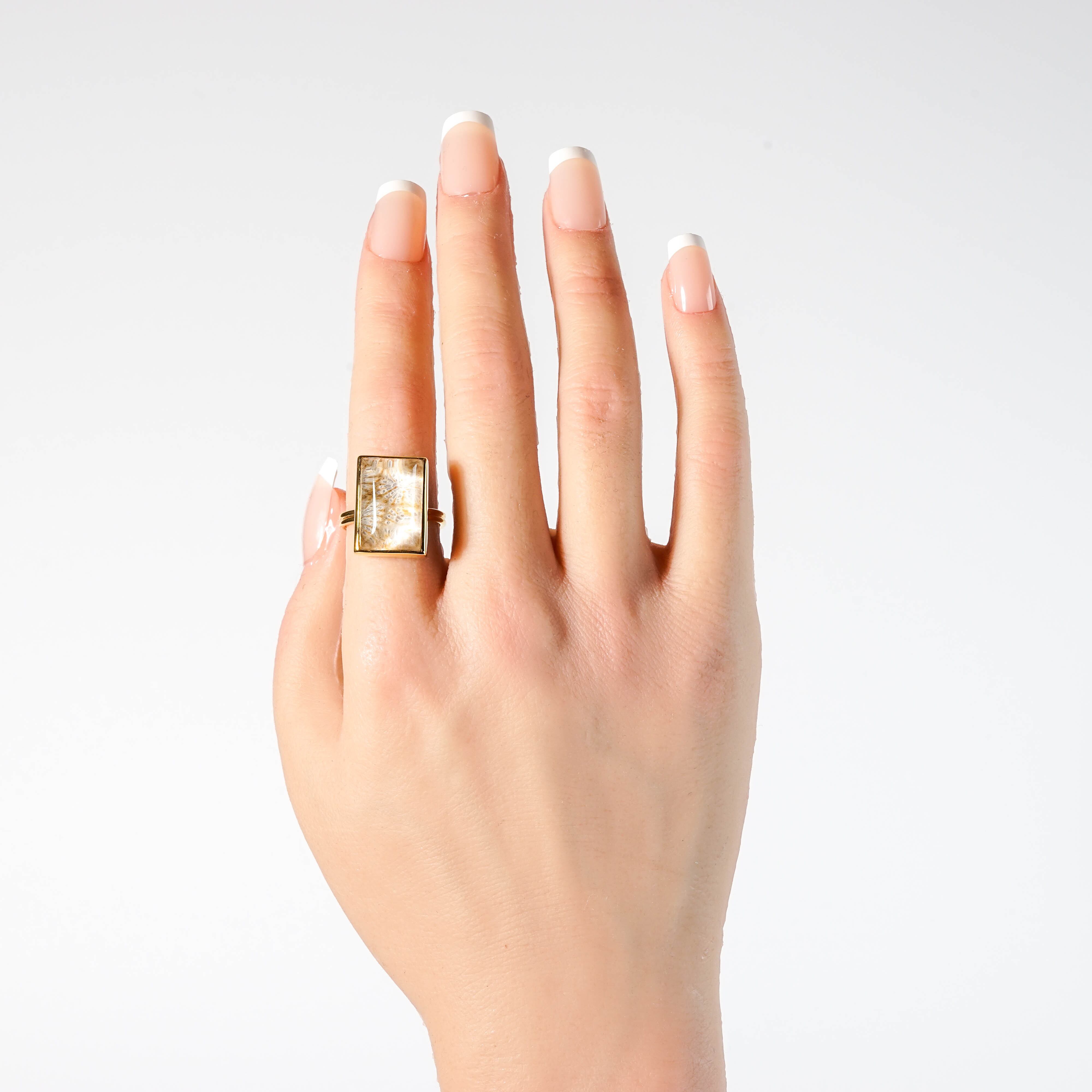 化石の様な鉱物みのある模様のコーラルアゲートと、透明感のあるルチルクォーツの2つの石を一緒に留めた珍しいリングです。程よくボリュームがあり、2つの石を合わせることによって生まれる、新しい光沢感が見て飽きない天然石リングです。 【素材】 天然石:コーラルアゲート x ルチルクォーツ ヴェルメイユ(SV925+18金マイクロコーティング) 【サイズ 】 フリーサイズ (推奨 10~15号) モチーフ:18x13.5mm 【石言葉】 アゲート:魔除けの石 ルチルクォーツ:金運と強運を運ぶ石 ※ご購入の前に【GUIDE】を必ずご一読お願いいたします。 ※リングの推奨サイズ (推奨 10~15号)以外の号数をご希望の場合は、購入前にお問い合わせください。