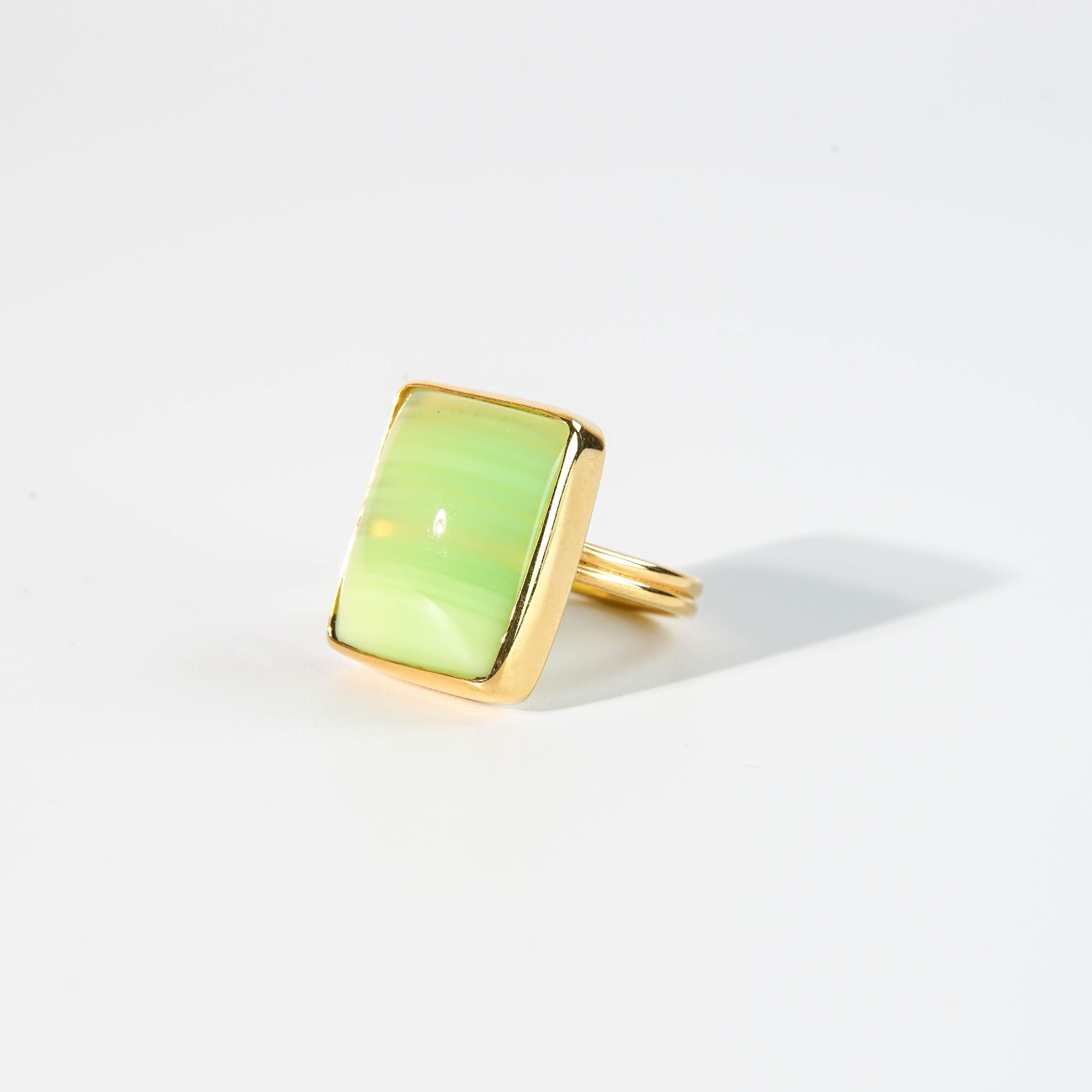 鮮やかなライトグリーンの美しいグラデーションが細いボーダー状になった印象的な天然石ピース。身につけるとパッと目を惹き、こちらの気分もパッと明るくしてくれるアイテムです。 【素材】 天然石:ウグイスアゲート ヴェルメイユ(SV925+18金マイクロコーティング) 【サイズ 】 フリーサイズ (推奨 10~15号) モチーフ:19.8x16.1mm 【石言葉】 心身のバランスを整え、健康運を高める石 ※ご購入の前に【GUIDE】を必ずご一読お願いいたします。 ※リングの推奨サイズ (推奨 10~15号)以外の号数をご希望の場合は、購入前にお問い合わせください。