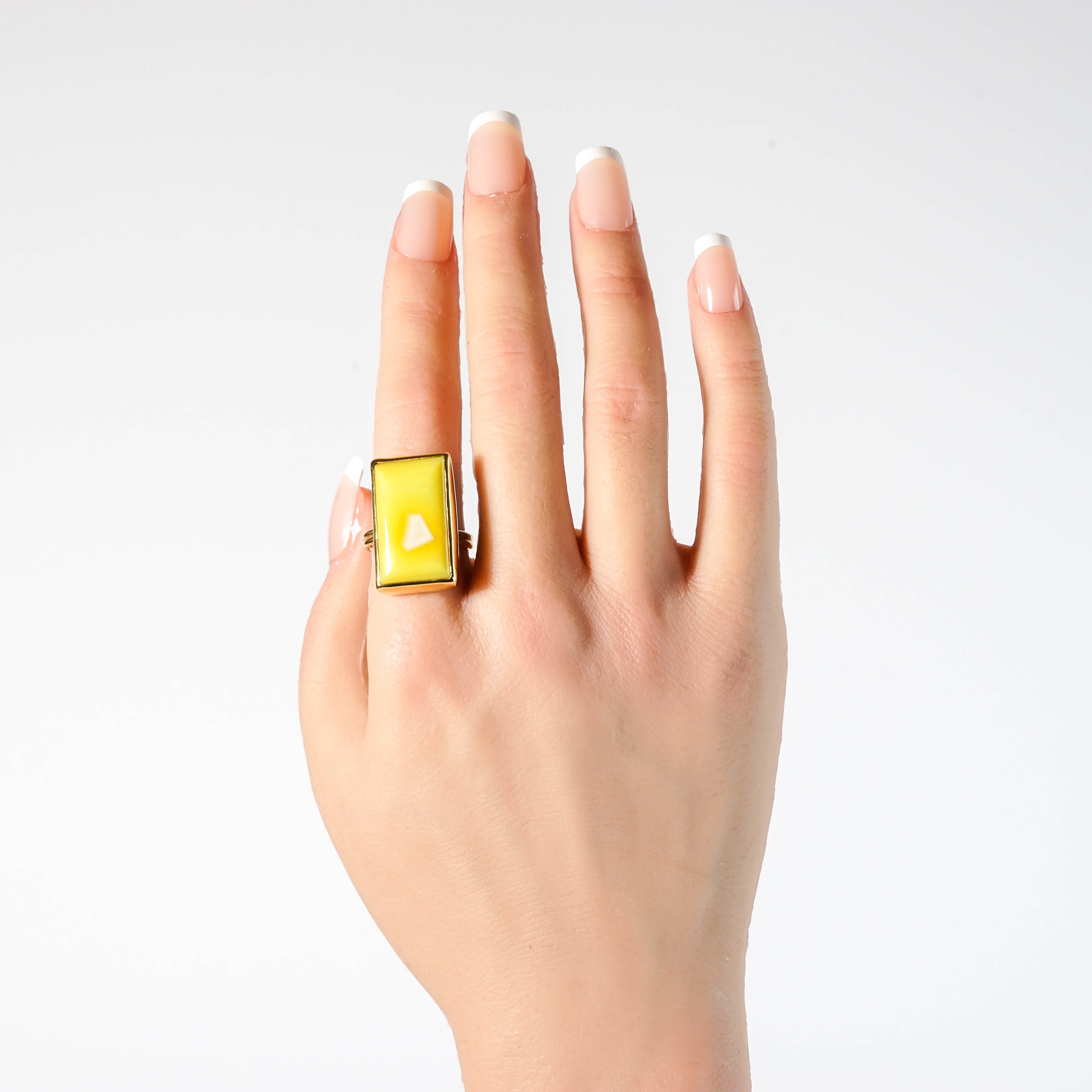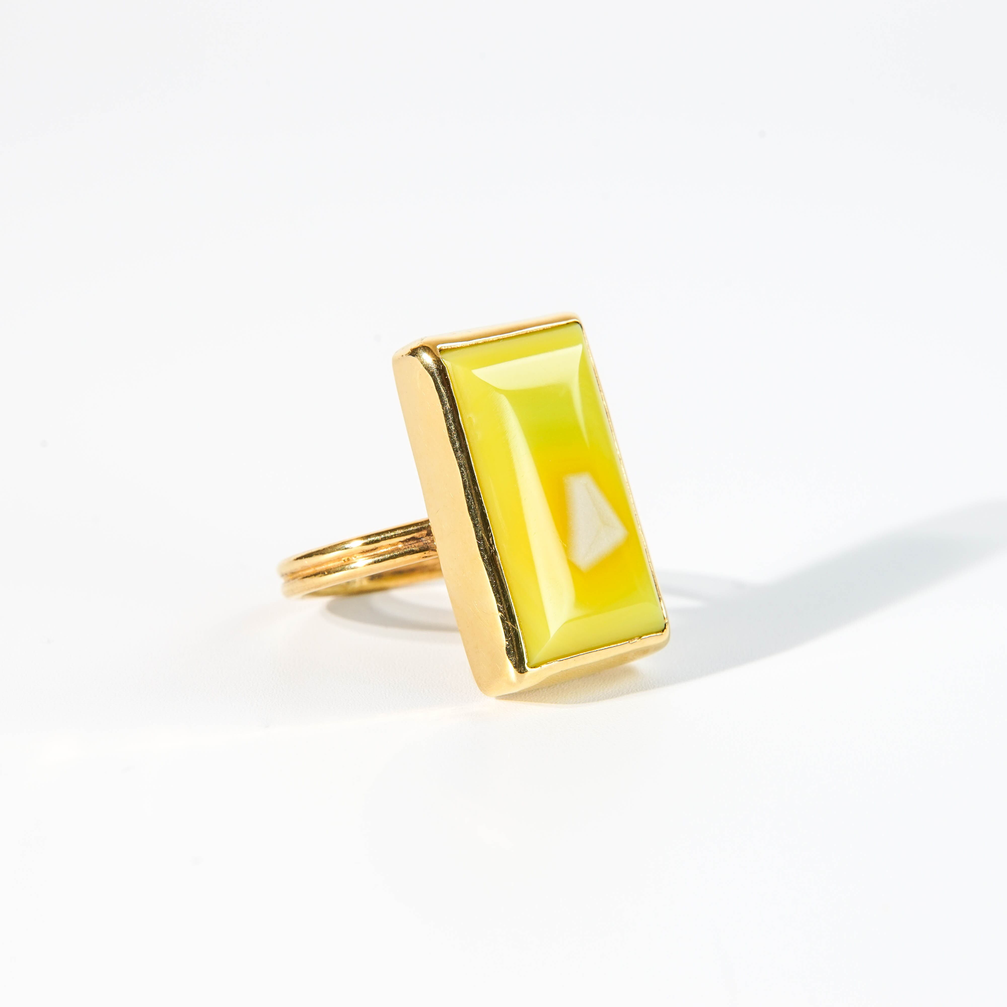 少しグリーン味を帯びたイエローのグラデーションが美しい天然石ピース。イエローでも品よくお召しいただける色味とフォルムが印象的です。 身につけるとパッと目を惹き、こちらの気分もパッと明るくしてくれるアイテムです。 【素材】 天然石:ウグイスアゲート ヴェルメイユ(SV925+18金マイクロコーティング) 【サイズ 】 フリーサイズ (推奨 10~15号) モチーフ:25.2x15.3mm 【石言葉】 心身のバランスを整え、健康運を高める石 ※ご購入の前に【GUIDE】を必ずご一読お願いいたします。 ※リングの推奨サイズ (推奨 10~15号)以外の号数をご希望の場合は、購入前にお問い合わせください。