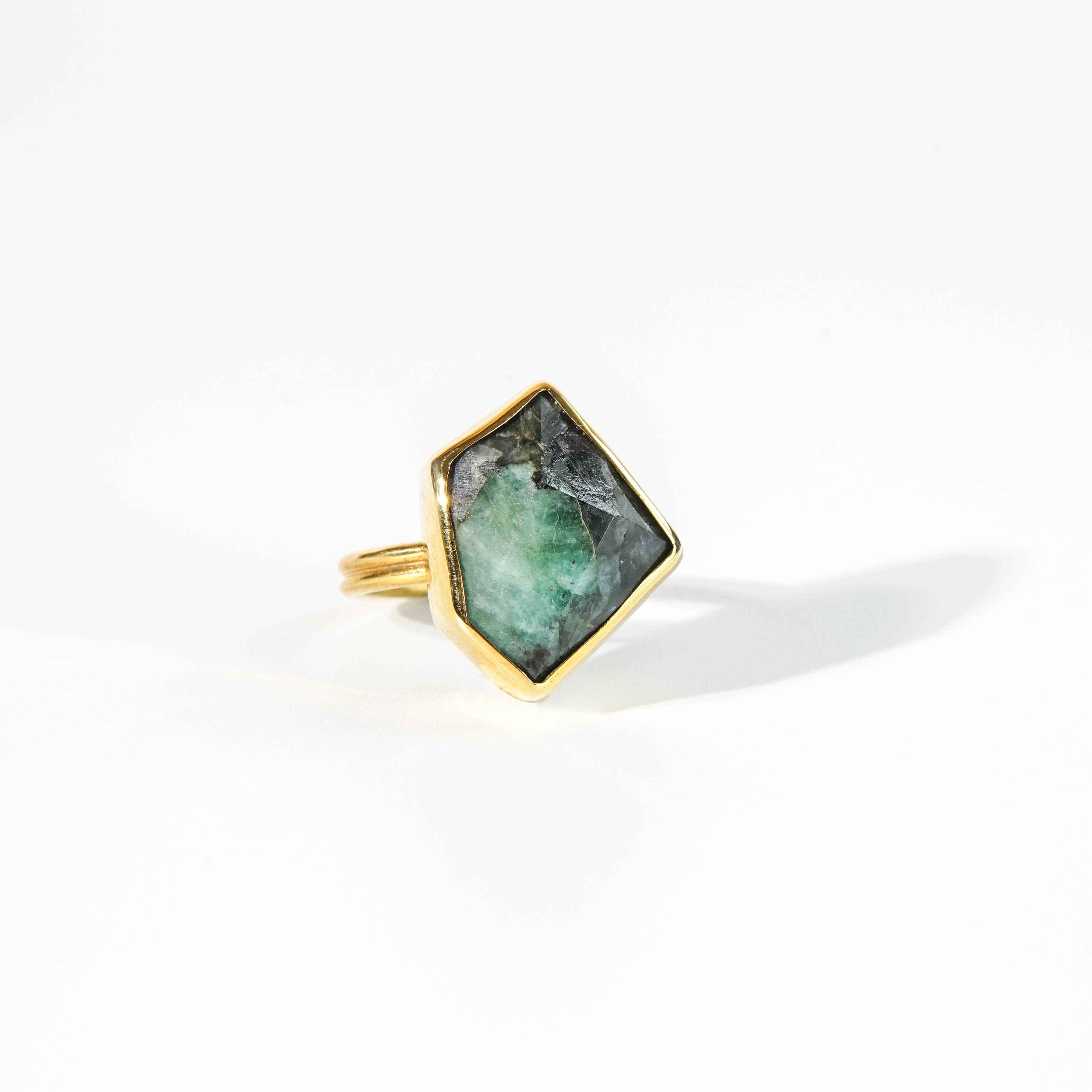 この天然石ピースは、鉱物感のあるエメラルドは、よくある艶やかで鮮やかなグリーンのイメージとは違い、エキゾチックな唯一無二の表情をしています。ラフカットも相まって、とてもスタイリッシュにコーディネートしていただけます。 【素材】 天然石:エメラルド ヴェルメイユ(SV925+18金マイクロコーティング) 【サイズ 】 フリーサイズ (推奨 10~15号) モチーフ:20.8x16.5mm 【石言葉】 愛を成就させる石 ※ご購入の前に【GUIDE】を必ずご一読お願いいたします。 ※リングの推奨サイズ (推奨 10~15号)以外の号数をご希望の場合は、購入前にお問い合わせください。