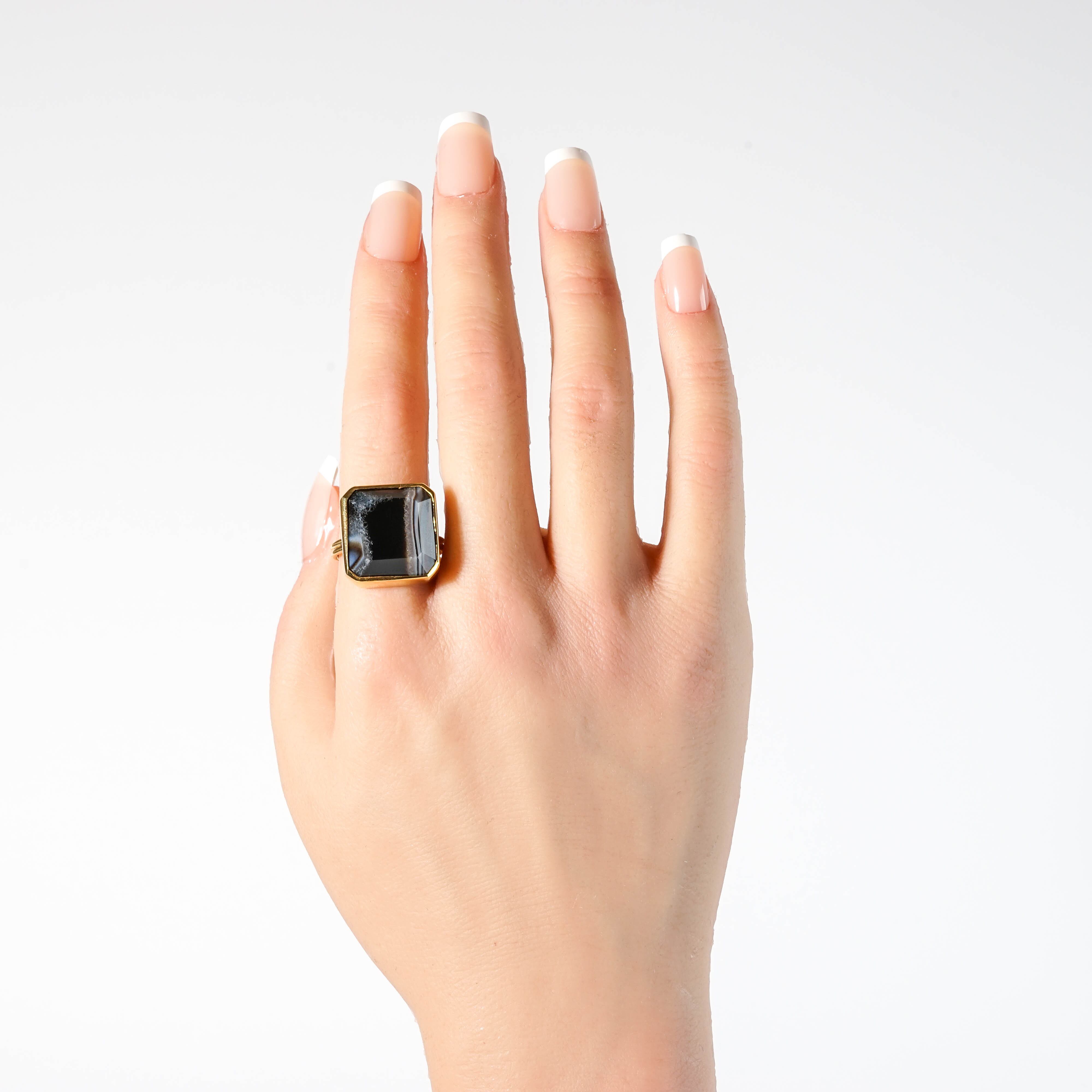 名前の通り、ストライプの模様が入ったオニキスは側面にも様々な模様があり、ブラックのワンカラーではない表情豊かな天然石ピースです。四角いフォルムも甘くなく、アクセントになりつつも、どんなコーディネートにも合わせやすい親和性があります。 【素材】 天然石:ストライプオニキス ヴェルメイユ(SV925+18金マイクロコーティング) 【サイズ 】 フリーサイズ (推奨 10~15号) モチーフ:18.5x17.7mm 【石言葉】 厄除の石 ※ご購入の前に【GUIDE】を必ずご一読お願いいたします。 ※リングの推奨サイズ (推奨 10~15号)以外の号数をご希望の場合は、購入前にお問い合わせください。